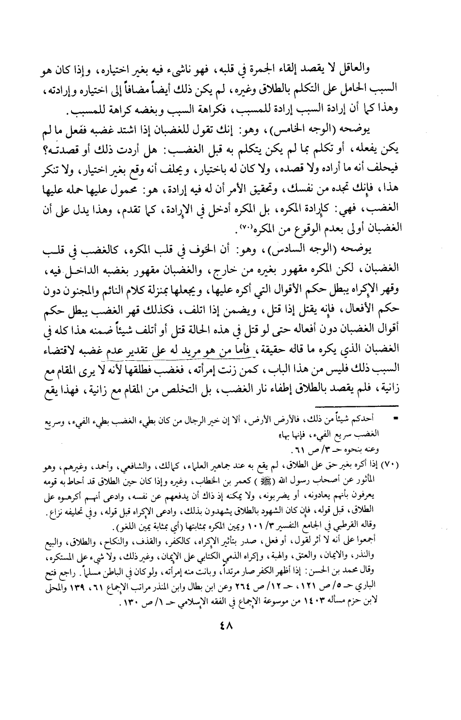 "الوجه الخامس" وهو: انك تقول للغضبان إذا اشتد غضبه ففعل ما لم يكن يفعله أو تكلم بما لم يكن يتكلم به قبل الغضب: هل اردت ذلك أو قصدته ? فيحلف انه ما اراده ولا قصده ولا كان له باختيار ويحلف انه وقع بغير اختيار ولا تنكر هذا فانك تجده من نفسك وتحقيق الأمر ان له فيه إرادة هو: محمول عليها حملة عليها الغضب فهي: كإرادة المكره بل المكره ادخل في الإرادة كما تقدم وهذا يدل على ان الغضبان أولى بعدم الوقوع من المكره. يوضحه