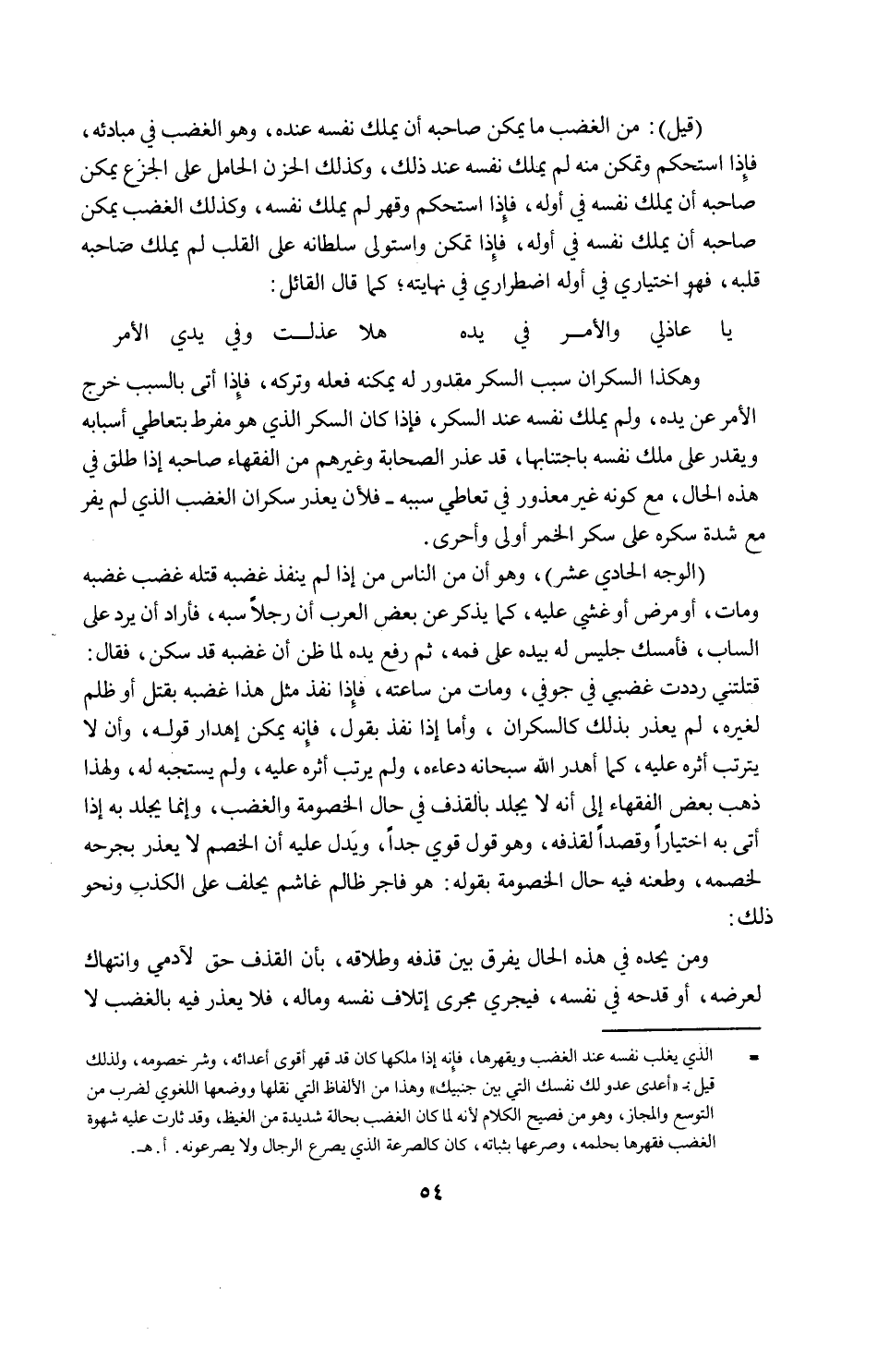 "الوجه الحادي عشر" وهو أن من الناس من إذا لم ينفذ غضبه قتله غضب غضبه ومات أو مرض أو اغشي عليه كما يذكر عن بعض العرب أن رجلا سبه فأراد أن يرد على الساب فامسك جليس له بيده على فمه ثم رفع يده لما ظن أن غضبه قد سكن فقال: قتلتني رددت غضبي في جوفي ومات من ساعته فإذا نفذ مثل هذا غضبه بقتل أو ظلم لغيره لم يعذر بذلك السكران واما إذا نفذ بقول فانه يمكن اهدار قوله وان لا يترتب اثره عليه كما أهدر الله سبحانه دعاءه ولم يرتب اثره عليه ولم يستجبه له ولهذا ذهب بعض الفقهاء إلى انه لا يجلد القذف في حال الخصومة والغضب وانما يجلد به إذا اتى به اختيارا وقصدا لقذفه وهو قول قوي جدا ويدل عليه ان الخصم لا يعذر بجرحه لخصمه وطعنه فيه حال الخصومة بقوله: هو فاجر ظالم غاشم يحلف على الكذب ونحو ذلك: ومن يحده في هذه الحال يفرق بين قذفه وطلاقة بان القدف حق لآدمي وانتهاك لعرضه أو قدحه في نفسه فيجري مجرى اتلاف نفسه وماله فلا يعذر فيه بالغضب لا