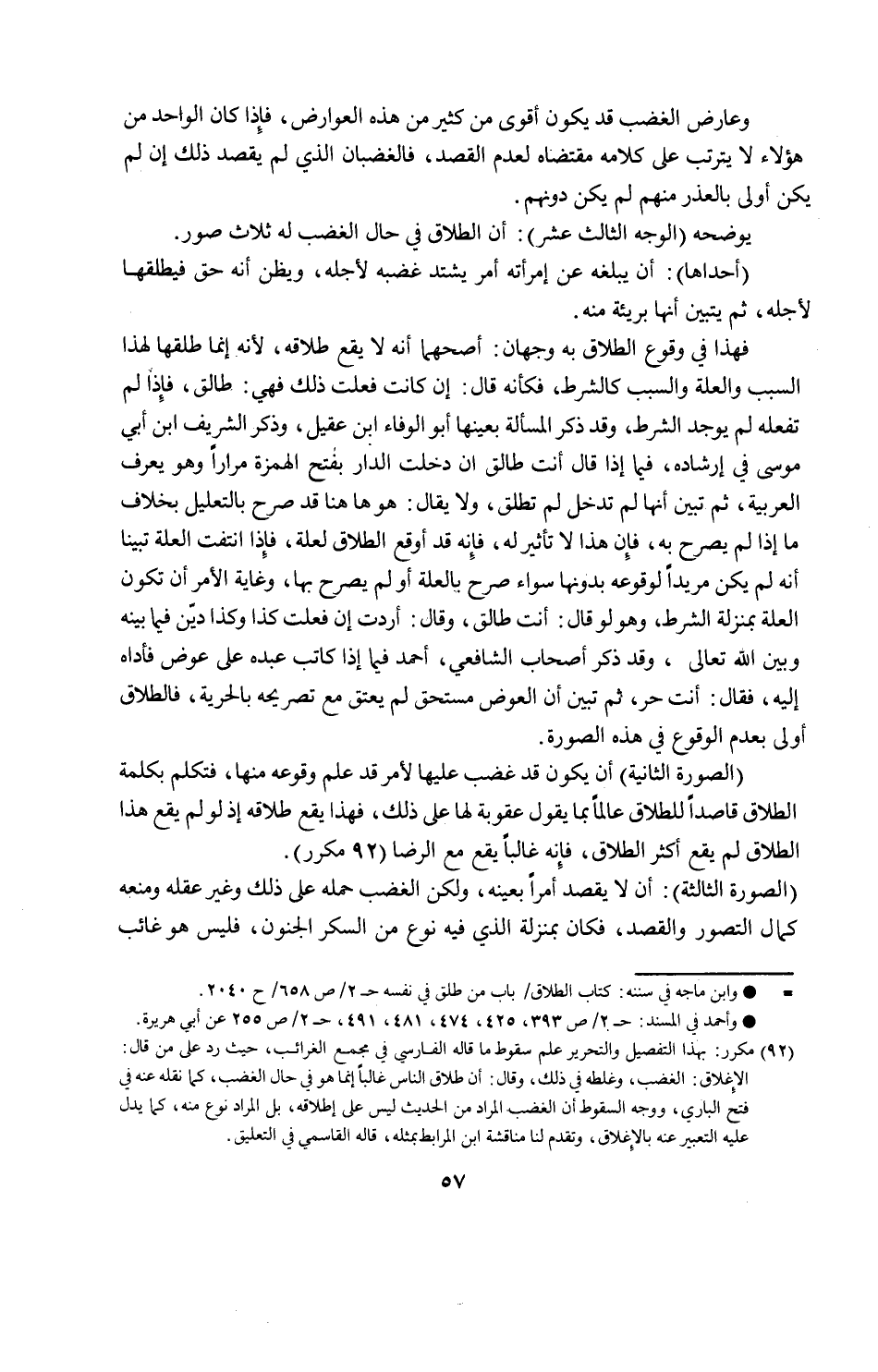 "الوجه الثالث عشر" ان الطلاق في حال الغضب له ثلاث صور "أحداها" ان يبلغه عن امرأته أمر يشتد غضبه لأجله ويظن انه حق فيطلقها لاجله ثم يتبين انها بريئة منه فهذا في وقوع الطلاق به وجهان أصحهما انه لا يقع طلاقه لإنه إنما طلقها لهذا السبب والعلة والسبب كالشرط فكانه قال ان كانت فعلت ذلك فهي طالق فإذا لم تفعله لم يوجد الشرط وقد ذكر المسالة بعينها ابو الوفاء ابن عقيل وذكر الشريف ابن ابي موسى في إرشاده فيما إذا قال أنت طالق إن دخلت الدار بفتح الهمزة مرارا وهو يعرف العربية ثم تبين أنها لم تدخل لم تطلق ولا يقال هو ها هنا قد صرح بالتعليل بخلاف ما إذا لم يصرح به فان هذا لا تأثير له فإنه قد أوقع الطلاق لعلة فإذا انتفت العلة تبينا انه لم يكن مريدا لوقوعه بدونها سواء صرح بالعلة أو لم يصرح بها وغاية الأمر ان تكون العلة بمنزلة الشرط وهو لو قال انت طلق وقال اردت ان فعلت كذا وكذا دين فيما بينه وبين الله تعالى وقد ذكر أصحاب الشافعي احمد فيما إذا كاتب عبده على عوض فاداه اليه فقال: انت حر ثم تبين ان العوض مستحق لم يعتق مع تصريحه بالحرية فالطلاق أولى بعدم الوقوع في هذه الصورة. "الصورة الثانية" ان يكون قد غضب عليها لامر قد علم وقوعه منها فتكلم بكلمة الطلاق قاصدا للطلاق عالما بما يقول عقوبة لها على ذلك فهذا يقع طلاقه اذ لو يقع هذا الطلاق لم يقع اكثر الطلاق فانه غالبا يقع مع الرضا "92 مكرر" "الصورة الثالثة": ان لا يقصد امرا بعينه ولكن الغضب حمله على ذلك وغير عقله ومنعه كمال التصور والقصد فكان بمنزلة الذي فيه نوع من السكر والجنون فليس هو غائب