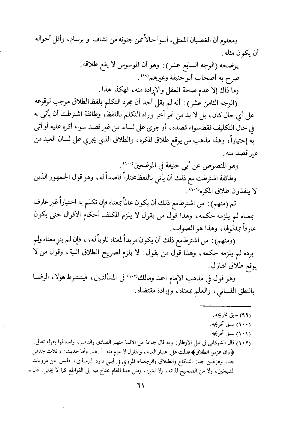 "الوجه الثامن عشر": انه لم يقل احد ان مجرد التكلم بلفظ الطلاق موجب لوقوعه على أي حال كان بل لابد من امر اخر وراء التكلم باللفظ وطائفة اشترطت ان ياتي به في حال التكليف فقط سواء قصده أو جرى على لسانه من غير سواء اكره عليه أو اتى به اختيارا وهذا مذهب من يوقع طلاق المكره والطلاق الذي يجري على لسان العبد من غير قصد منه وهو المنصوص عن ابي حنيفة في الموضعين وطائفة اشترطت مع ذلك ان ياتي باللفظ مختار قاصدا له وهو قول الجمهور الذين لا ينفدون طلاق المكره. ثم منهم من اشترط مع ذلك ان يكون عالما بمعناه فان تكلم به اختيارا غير عارف بمعناه لم يلزمه حكمه وهذا قول من يقول لا يلزم المكلف أحكام الأقوال حتى يكون عارفا بمدلولها وهذا هو الصواب. ومنهم: من اشترط مع ذلك ان يكون مريدا لمعناه ناويا له فان لم ينو معناه ولم يرده لم يلزمه حكمه وهذا قول من يقول: لا يلزم لصريح الطلاق النية وقول من لا يوقع الطلاق الهازل. وهو قول في مذهب الإمام احمد ومالك في المسالتين فيشترط هؤلاء الرضا بالنطق اللساني والعلم بمعناه وإرادة مقتضاه.