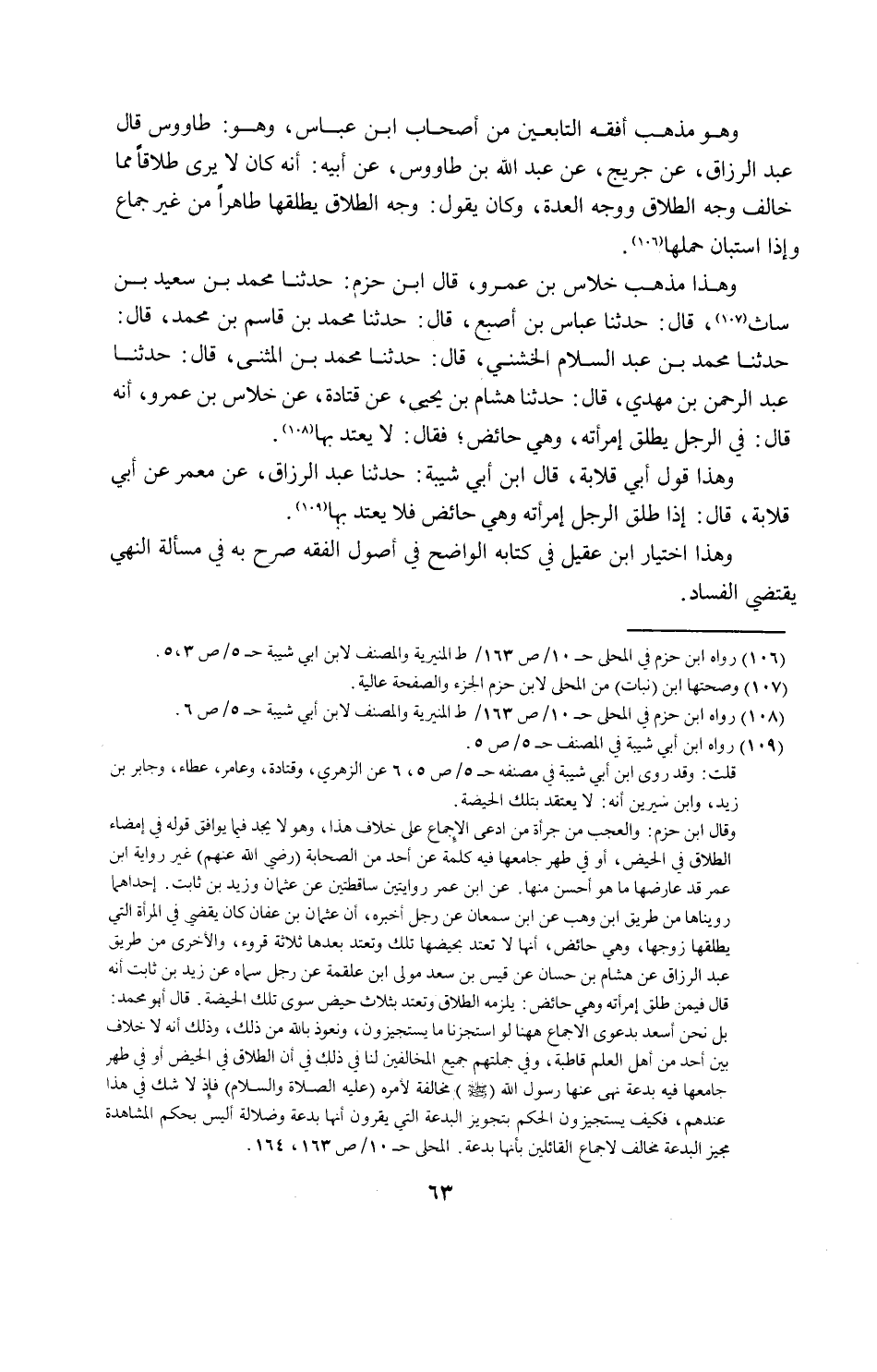 وهو مذهب افقه التابعين من اصحاب ابن عباس وهو طاوس قال عبد الرزاق عن جريج عن عبد الله بن طاووس عن ابيه: انه كان لا يرى طلاقا مما خالف وجه الطلاق ووجه العدة وكان يقول: وجه الطلاق يطلقها طاهرا من غير جماع وإذا استبان حملها. وهذا مذهب خلاس بن عمرو قال ابن خزم: حدثنا محمد بن سعيد بن ساث قال: حدثنا عباس بن اصبع قال: حدثنا محمد بن قاسم بن محمد قال: حدثنا محمد بن عبد السلام الخشني قال: حدثنا محمد بن المثنى قال: حدثنا عبد الرحمن من مهدي قال: حدثنا هشام بن يحيى عن قتادة عن خلاس بن عمرو انه قال: في الرجل يطلق امراته وهي حائض فقال: لا يعتد بها. وهذا قول ابي قلابة قال ابن ابي شيبة: حدثنا عبد الرزاق عن معمر عن ابي قلابة قال: إذا طلق الرجل امراته وهي حائض فلا يعتد بها. وهذا اختيار ابن عقيل في كتابه الواضح في اصول الفقه صرح به في مسالة النهي يقتضي الفساد