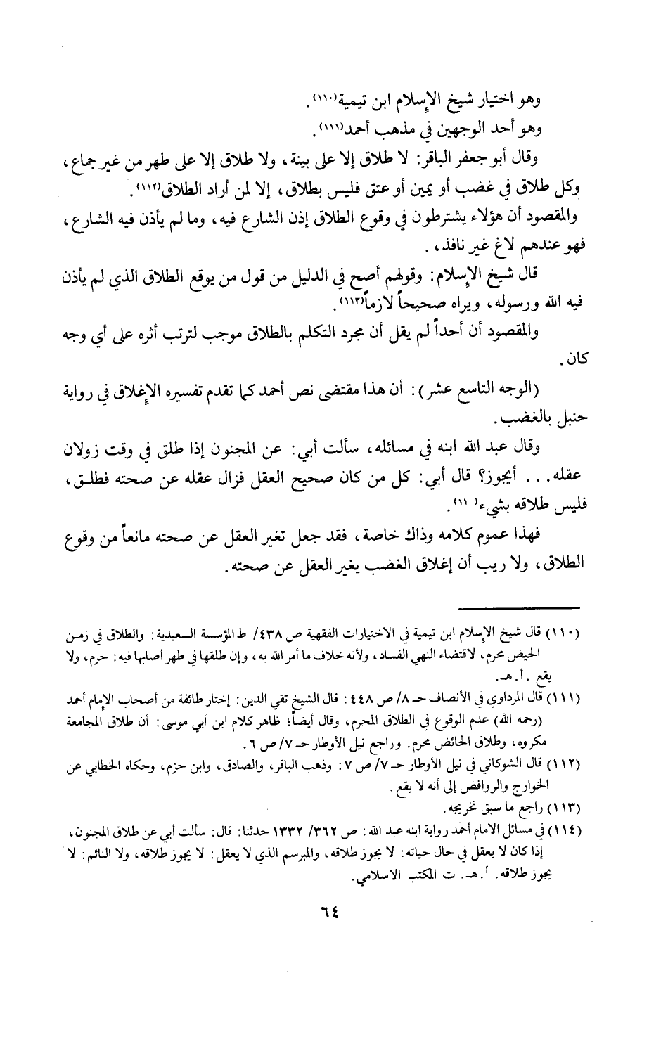 "الوجه التاسع عشر" ان هذا مقتضى نص احمد كما تقدم تفسيره الاغلاق في رواية حنبل بالغضب وقال عبد الله ابنه في مسائلة سالت ابي عن المجنون إذا طلق في وقت زولان عقله. . . . أيجوز ? قال ابي: كل من كان صحيح العقل فزال عقله عن صحته فطلق فليس طلاقه بشيء فهذا عموم كلامه وذاك خاصة فقد جعل تغير العقل عن صحته مانعا من وقوع الطلاق ولا ريب ان اغلاق الغضب بغير العقل عن صحته.