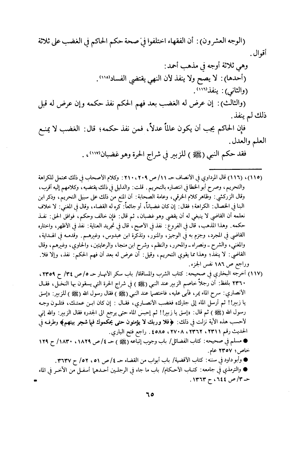 "الوجه العشرون": ان الفقهاء اختلفوا في صحة حكم الحاكم في الغضب على ثلاثة أقوال: وهي ثلاثة أوجه في مذهب احمد: "احدها": لا يصح ولا ينفذ لان النهي يقتضي الفساد "والثاني": ينفذ "والثالث": ان عرض له الغضب بعد فهم الحكم نفذ حكمه وان عرض له قبل ذلك لم ينفذ. فان الحاكم يجب ان يكون عالما عدلا فمن نفذ حكمه قال: الغضب لا يمنع العلم والعدل. فقد حكم النبي صلى الله عليه وسلم للزبير في شراج الحرة وهو غضبان.