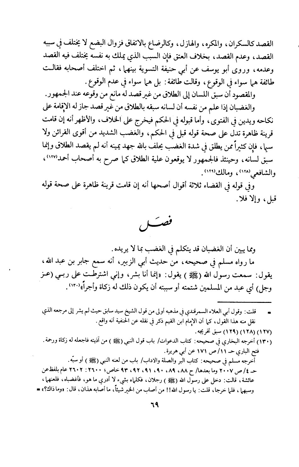 القصد كالسكران والمكره والهازل وكالرضاع بالاتفاق فزوال البضع لا يختلف في سببه القصد وعدم القصد بخلاف العتق فان السبب الذي يملك به نفسه يختلف فيه القصد وعدمه وروى ابو يوسف عن ابي حنيفة التسوية بينهما ثم اختلف اصحابه فقالت طائفة هما سواء في الوقوع وقالت طائفة بل هما سواء في عدم الوقوع والمقصود ان سبق اللسان إلى الطلاق من غير قصد له مانع من وقوعه عند الجمهور والغضبان إذا علم من نفسه ان لسانه سبقه بالطلاق من غير قصد جاز له الاقامة على نكاحه ويدين في الفتوى واما قبوله في الحكم فيخرج على الخلاف والأظهر انه ان قامت قرينة ظاهرة تدل على صحة قوله قبل في الحكم والغضب الشديد من اقوى القرائن ولا سيما فان كثيرا ممن يطلق في شدة الغضب يحلف بالله جهد يمينه انه لم يقصد الطلاق وانما سبق لسانه وحينئذ فالجمهور لا يوقعون عليه الطلاق كما صرح به اصحاب احمد والشافعي ومالك. وفي قوله في القضاء ثلاثة أقوال اصحها انه ان قامت قرينة ظاهرة على صحة قوله قبل والا فلا