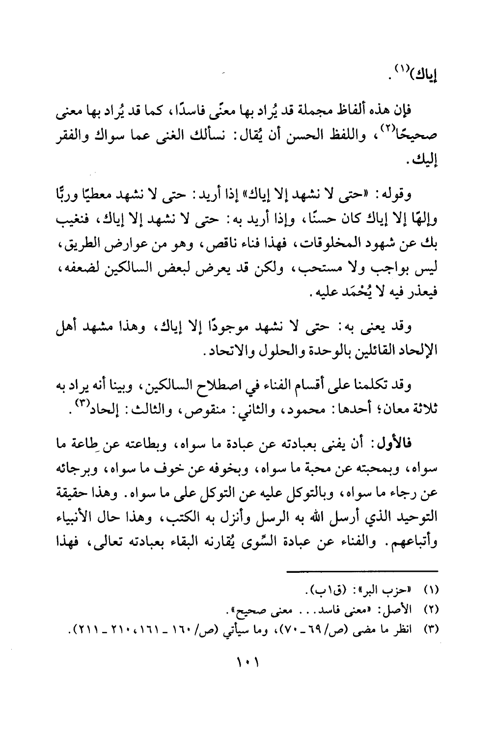 وقوله حتى لا نشهد إلا إياك إذا أريد حتى لا نشهد معطيًا وربًّا وإلهًا إلا إياك كان حسنًا وإذا أريد به حتى لا نشهد إلا إياك فنغيب بك عن شهود المخلوقات فهذا فناء ناقص وهو من عوارض الطريق ليس بواجب ولا مستحب ولكن قد يعرض لبعض السالكين لضعفه فيعذر فيه ولا يُحْمَد عليه.