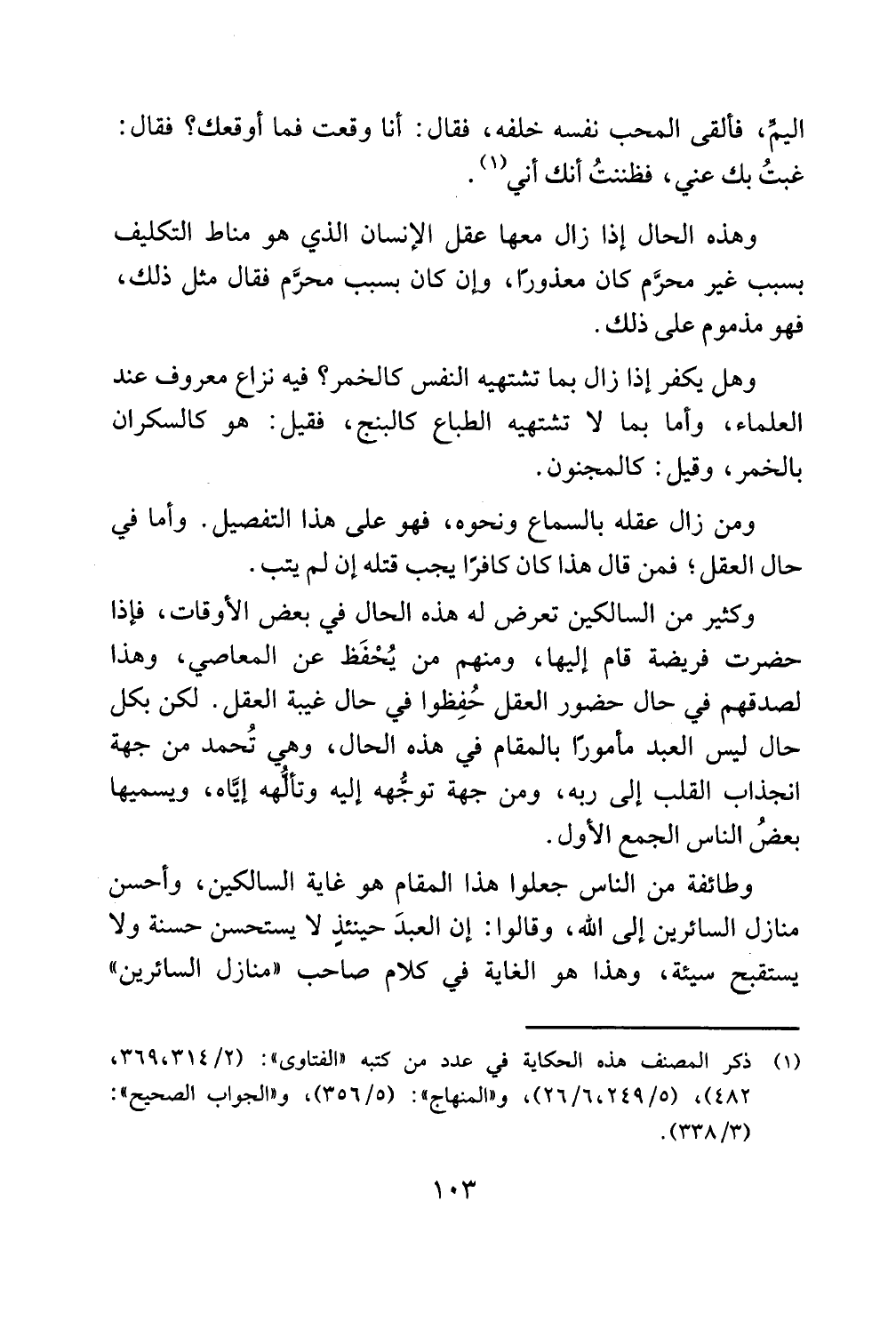 وكثير من السالكين تعرض له هذه الحال في بعض الأوقات فإذا حضرت فريضة قام إليها ومنهم من يُحْفَظ عن المعاصي وهذا لصدقهم في حال حضور العقل حُفِظوا في حال غيبة العقل لكن بكل حال ليس العبد مأمورًا بالمقام في هذه الحال وهي تُحمد من جهة انجذاب القلب إلى ربه ومن جهة توجُّهه إليه وتألُّهه إيَّاه ويسميها بعضُ الناس الجمع الأول.