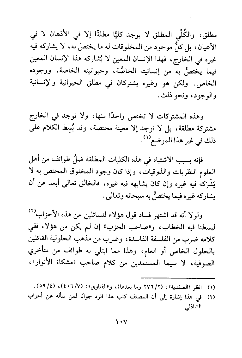 فإنه بسبب الاشتباه في هذه الكليات المطلقة ضلَّ طوائف من أهل العلوم النظريات والذوقيات وإذا كان وجود المخلوق المختص به لا يَشْرَكه فيه غيره وإن كان يشابهه فيه غيره فالخالق تعالى أبعد عن أن يشاركه غيره فيما يختصُّ به سبحانه وتعالى.