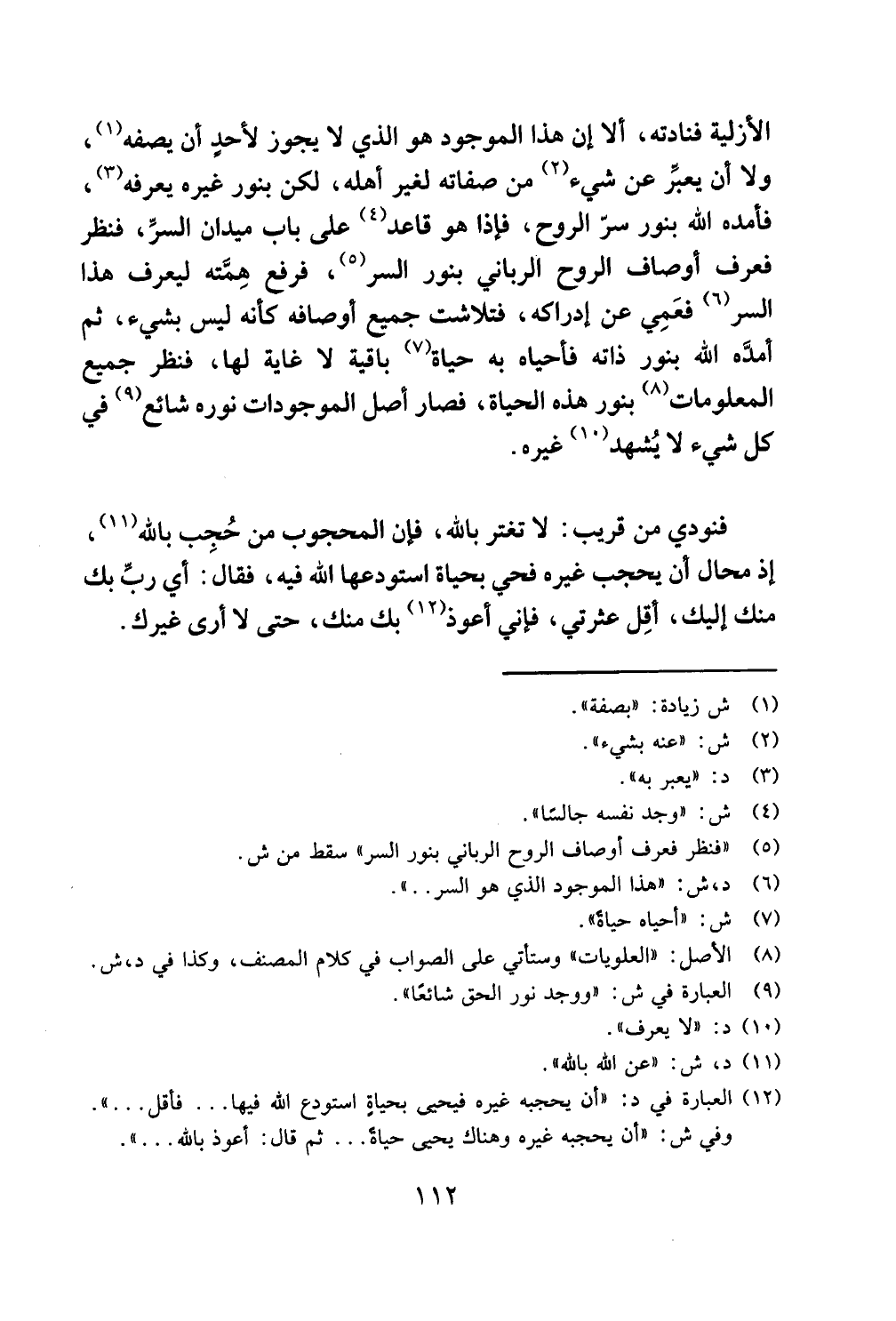 الأزلية فنادته ألا إن هذا الموجود هو الذي لا يجوز لأحدٍ أن يصفه ولا أن يعبِّر عن شيء من صفاته لغير أهله لكن بنور غيره يعرفه فأمده الله بنور سرّ الروح فإذا هو قاعد على باب ميدان السرِّ فنظر فعرف أوصاف الروح الرباني بنور السر فرفع هِمَّته ليعرف هذا السر فعَمِي عن إدراكه فتلاشت جميع أوصافه كأنه ليس بشيء ثم أمدَّه الله بنور ذاته فأحياه به حياة باقية لا غاية لها فنظر جميع المعلومات بنور هذه الحياة فصار أصل الموجودات نوره شائع في كل شيء لا يُشهد غيره.
