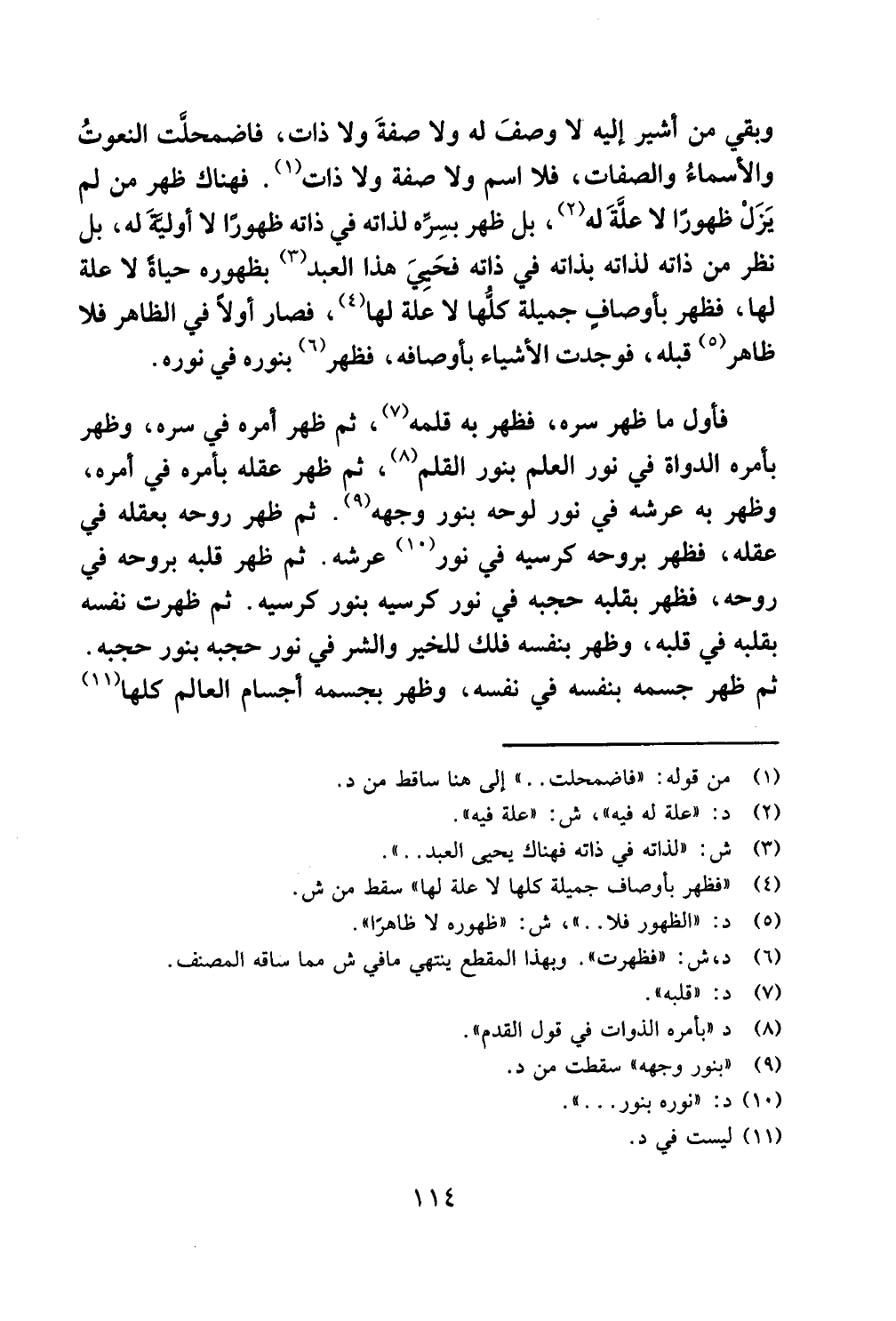 وبقي من أشير إليه لا وصفَ له ولا صفةَ ولا ذات فاضمحلَّت النعوتُ والأسماءُ والصفات فلا اسم ولا صفة ولا ذات فهناك ظهر من لم يَزَلْ ظهورًا لا علَّةَ له بل ظهر بسِرِّه لذاته في ذاته ظهورًا لا أوليَّةَ له بل نظر من ذاته لذاته بذاته في ذاته فحَيِيَ هذا العبد بظهوره حياةً لا علة لها فظهر بأوصافٍ جميلة كلُّها لا علة لها فصار أولاً في الظاهر فلا ظاهر قبله فوجدت الأشياء بأوصافه فظهر بنوره في نوره.