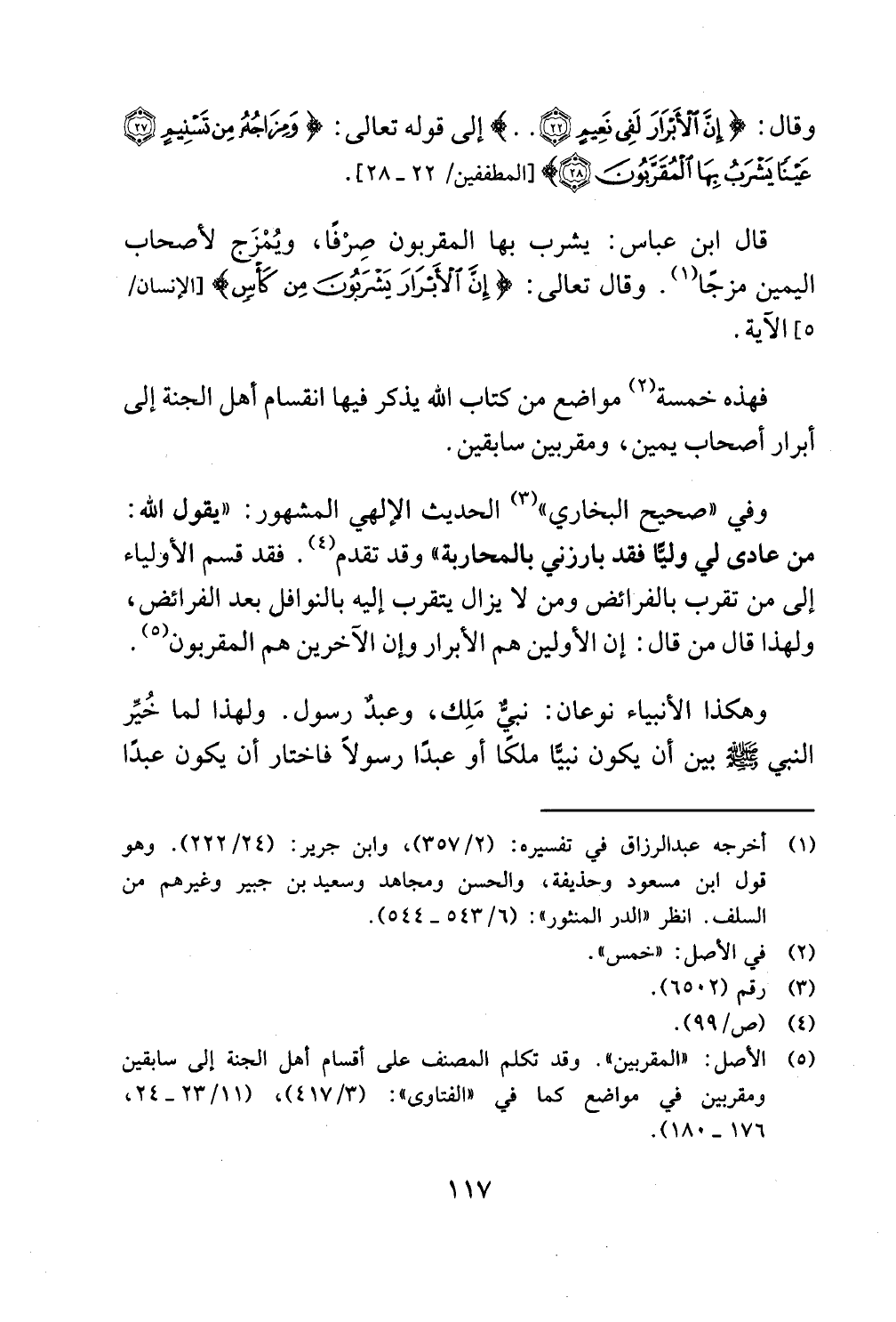 وفي صحيح البخاري الحديث الإلهي المشهور يقول الله من عادى لي وليًّا فقد بارزني بالمحاربة وقد تقدم فقد قسم الأولياء إلى من تقرب بالفرائض ومن لا يزال يتقرب إليه بالنوافل بعد الفرائض ولهذا قال من قال إن الأولين هم الأبرار وإن الآخرين هم المقربون.