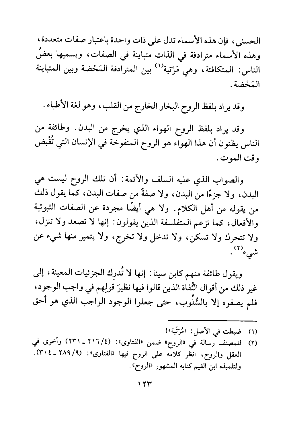 ويقول طائفة منهم كابن سينا إنها لا تُدرِك الجزئيات المعينة إلى غير ذلك من أقوال النُّفاة الذين قالوا فيها نظيرَ قولِهم في واجب الوجود فلم يصفوه إلا بالسُّلُوب حتى جعلوا الوجود الواجب الذي هو أحق
