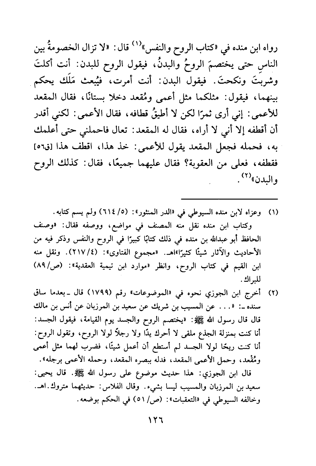 رواه ابن منده في كتاب الروح والنفس قال لا تزال الخصومةُ بين الناسِ حتى يختصمَ الروحُ والبدنُ فيقول الروح للبدن أنت أكلتَ وشربتَ ونكحتَ فيقول البدن أنت أمرت فيُبعث مَلَك يحكم بينهما فيقول مثلكما مثل أعمى ومُقعد دخلا بستانًا فقال المقعد للأعمى إني أرى ثمرًا لكن لا أطيقُ قطافه فقال الأعمى لكني أقدر أن أقطفه إلا أني لا أراه فقال له المقعد تعال فاحملني حتى أعلمك به فحمله فجعل المقعد يقول للأعمى خذ هذا اقطف هذا فقطفه فعلى من العقوبة فقال عليهما جميعًا فقال كذلك الروح والبدن.