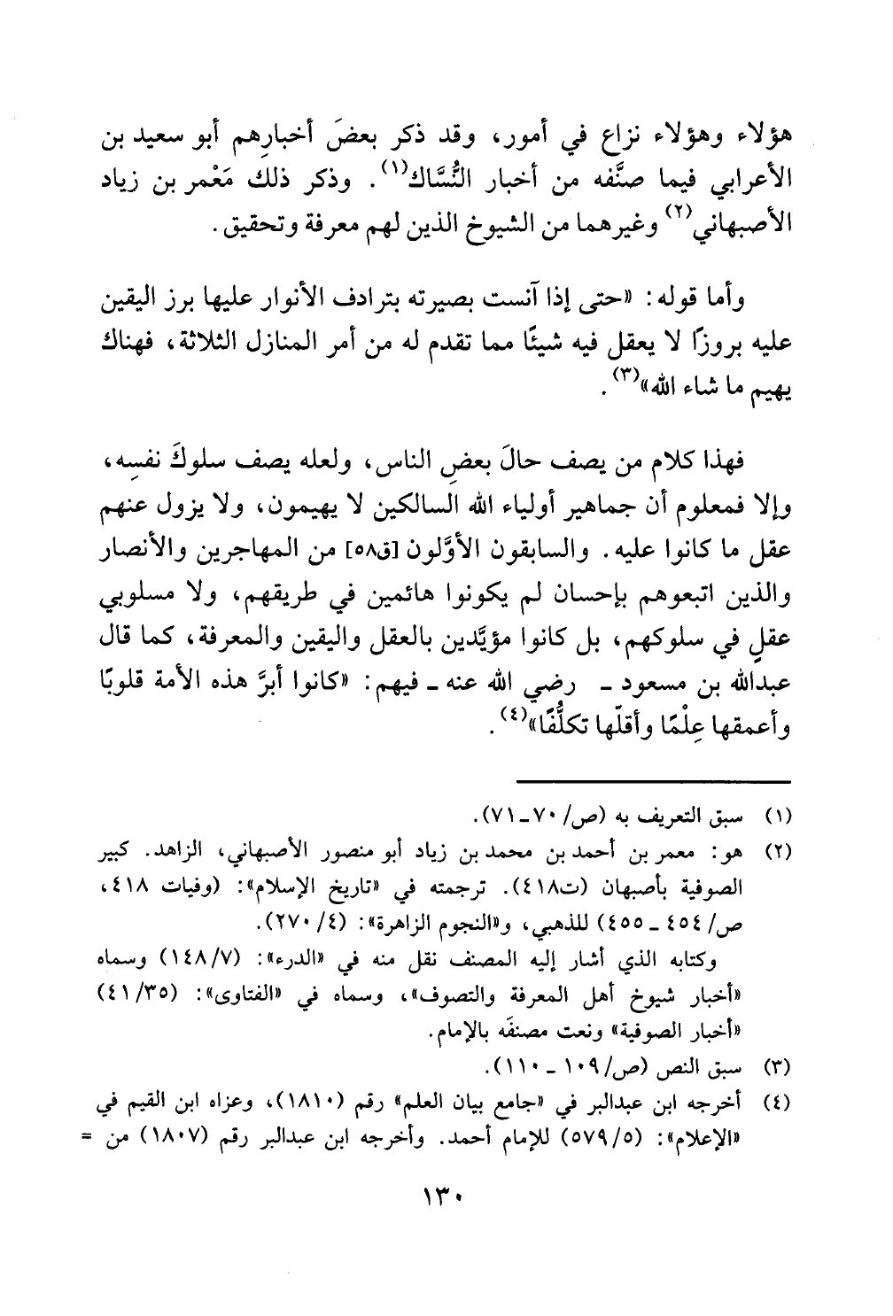 فهذا كلام من يصف حالَ بعضِ الناس ولعله يصف سلوكَ نفسِه وإلا فمعلوم أن جماهير أولياء الله السالكين لا يهيمون ولا يزول عنهم عقل ما كانوا عليه والسابقون الأوَّلون من المهاجرين والأنصار والذين اتبعوهم بإحسان لم يكونوا هائمين في طريقهم ولا مسلوبي عقلٍ في سلوكهم بل كانوا مؤيَّدين بالعقل واليقين والمعرفة كما قال عبد الله بن مسعود رضي الله عنه فيهم كانوا أبرَّ هذه الأمة قلوبًا وأعمقها عِلْمًا وأقلّها تكلُّفًا.