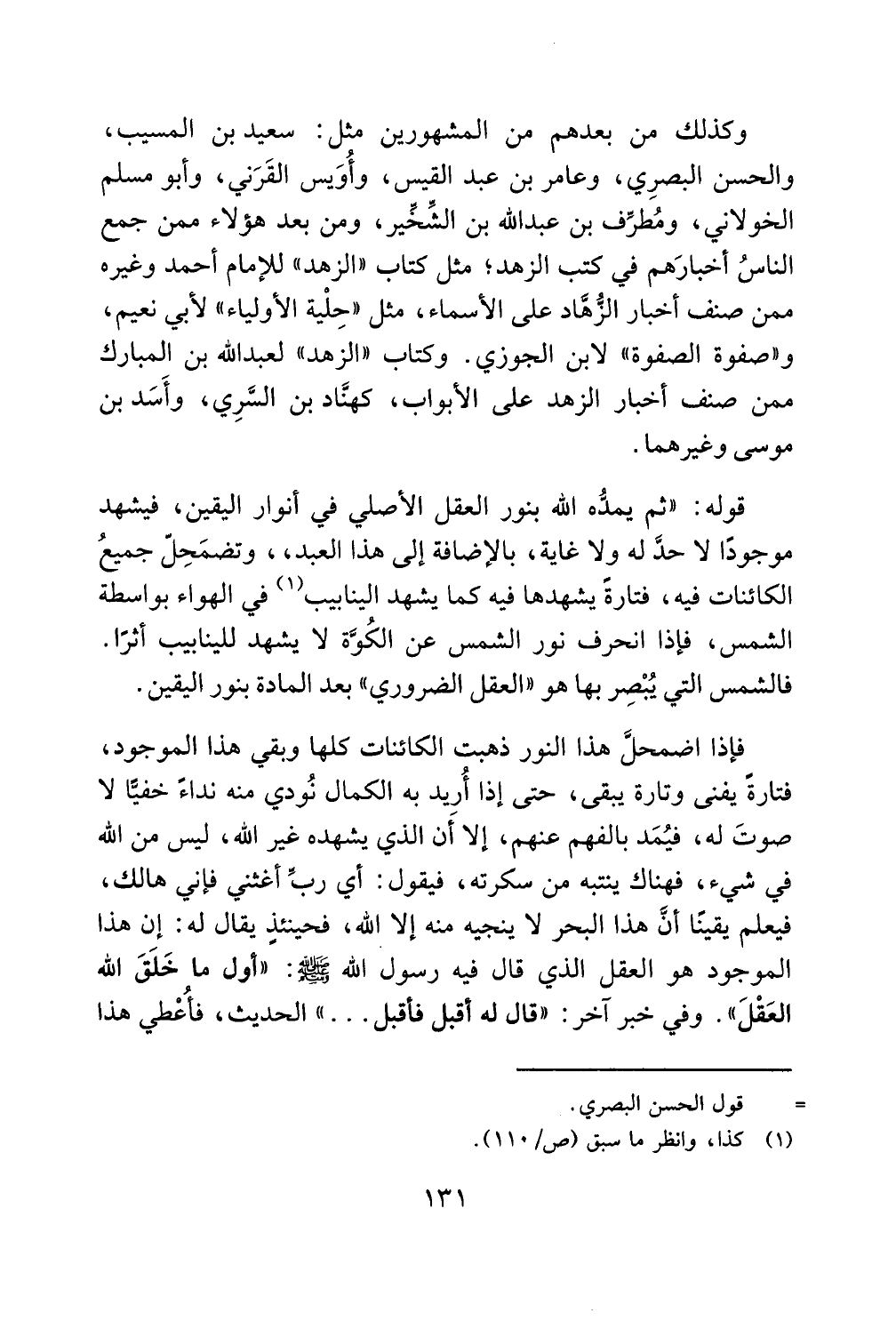 فإذا اضمحلَّ هذا النور ذهبت الكائنات كلها وبقي هذا الموجود فتارةً يفنى وتارة يبقى حتى إذا أُرِيد به الكمال نُودي منه نداءً خفيًّا لا صوتَ له فيُمَد بالفهم عنهم إلا أَن الذي يشهده غير الله ليس من الله في شيء فهناك ينتبه من سكرته فيقول أي ربِّ أغثني فإني هالك فيعلم يقينًا أنَّ هذا البحر لا ينجيه منه إلا الله فحينئذٍ يقال له إن هذا الموجود هو العقل الذي قال فيه رسول الله صلى الله عليه وسلم أول ما خَلَقَ الله العَقْلَ وفي خبر آخر قال له أقبل فأقبل الحديث فأُعْطي هذا