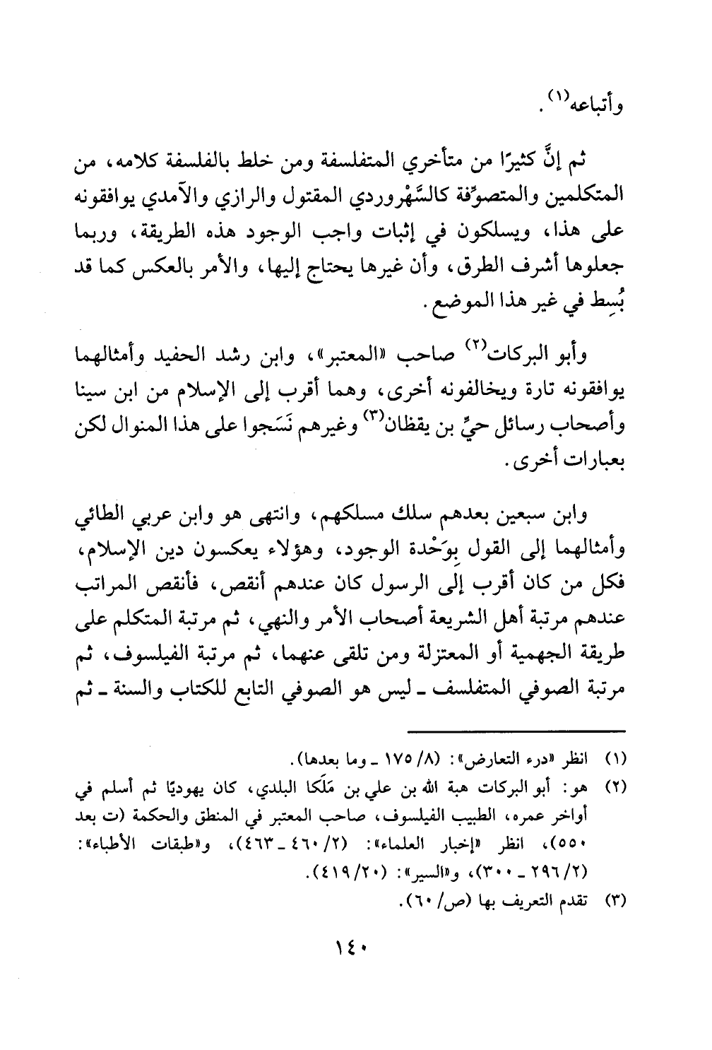 وأبو البركات صاحب المعتبر وابن رشد الحفيد وأمثالهما يوافقونه تارة ويخالفونه أخرى وهما أقرب إلى الإسلام من ابن سينا وأصحاب رسائل حيِّ بن يقظان وغيرهم نَسَجوا على هذا المنوال لكن بعبارات أخرى.