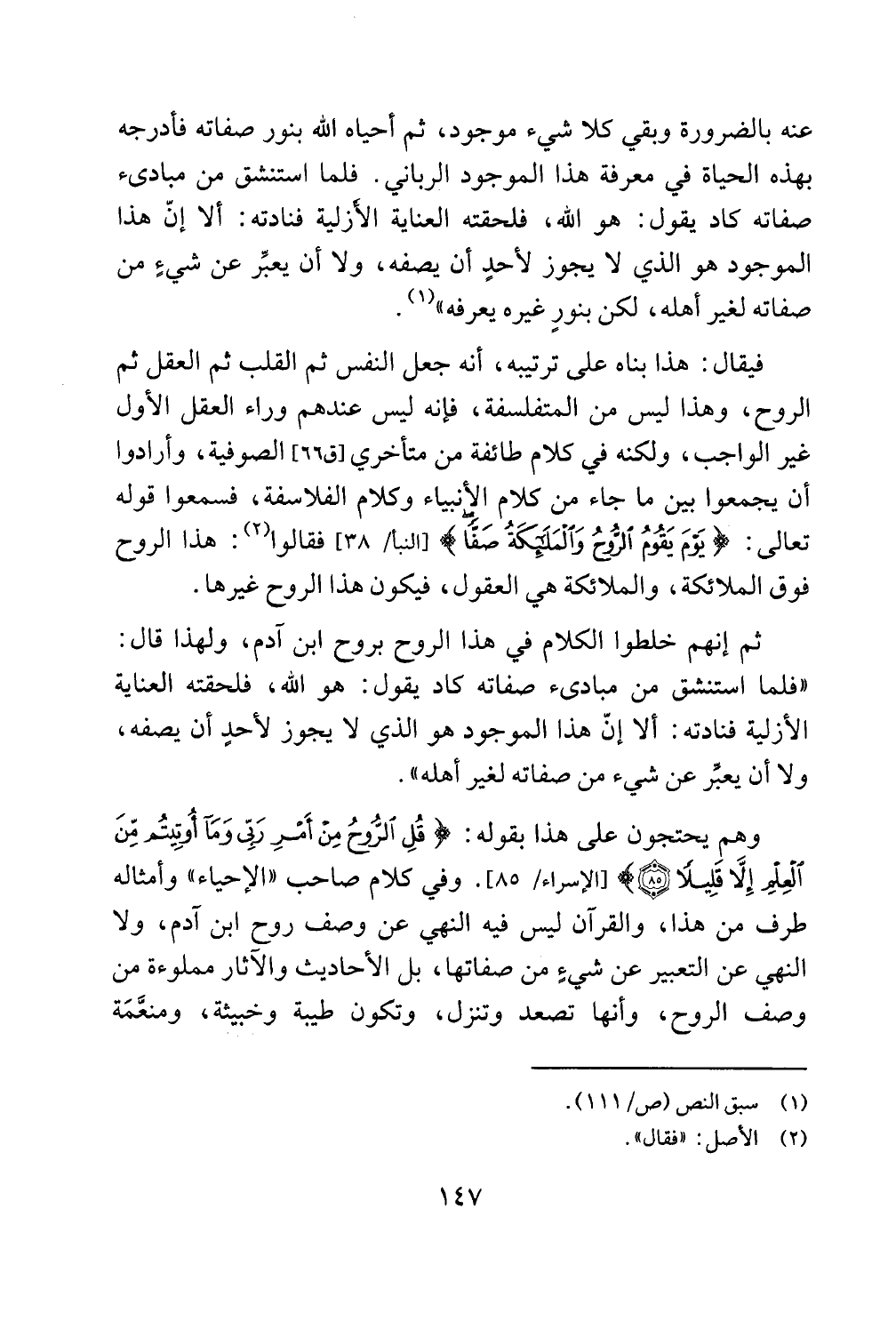 ثم إنهم خلطوا الكلام في هذا الروح بروح ابن آدم ولهذا قال فلما استنشق من مبادئ صفاته كاد يقول هو الله فلحقته العناية الأزلية فنادته ألا إنّ هذا الموجود هو الذي لا يجوز لأحدٍ أن يصفه ولا أن يعبِّر عن شيء من صفاته لغير أهله.