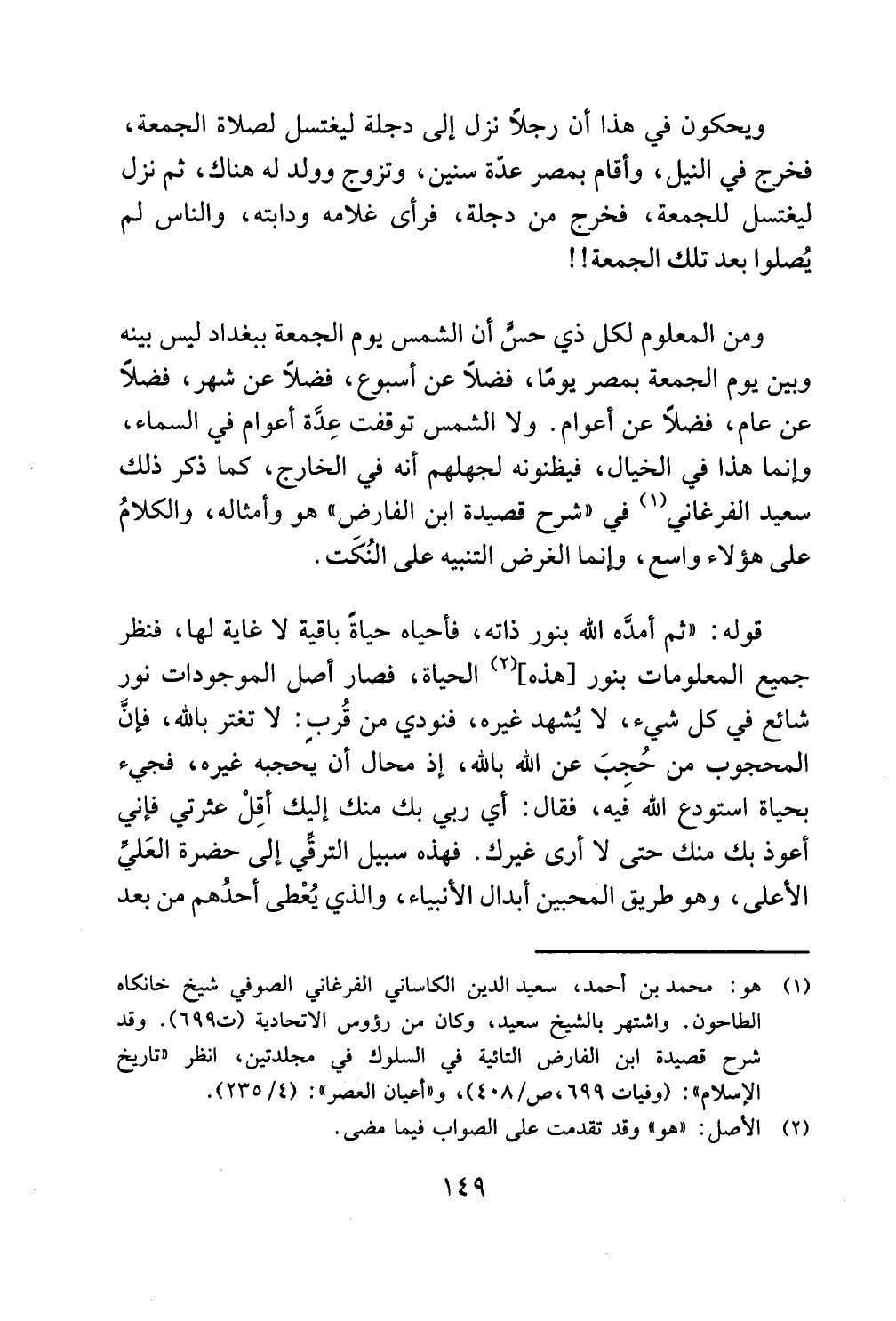 ومن المعلوم لكل ذي حسٍّ أن الشمس يوم الجمعة ببغداد ليس بينه وبين يوم الجمعة بمصر يومًا فضلاً عن أسبوع فضلاً عن شهر فضلاً عن عام فضلاً عن أعوام ولا الشمس توقفت عِدَّة أعوام في السماء وإنما هذا في الخيال فيظنونه لجهلهم أنه في الخارج كما ذكر ذلك سعيد الفرغاني في شرح قصيدة ابن الفارض هو وأمثاله والكلامُ على هؤلاء واسع وإنما الغرض التنبيه على النُكَت.
