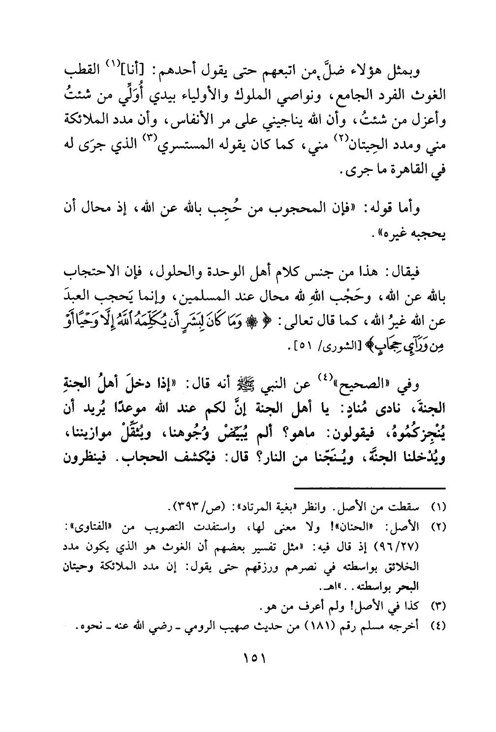 وبمثل هؤلاء ضلَّ من اتبعهم حتى يقول أحدهم [أنا] القطب الغوث الفرد الجامع ونواصي الملوك والأولياء بيدي أُوَلِّي من شئتُ وأعزل من شئتُ وأن الله يناجيني على مر الأنفاس وأن مدد الملائكة مني ومدد الحِيتان مني كما كان يقوله المستسري الذي جرَى له في القاهرة ما جرى.