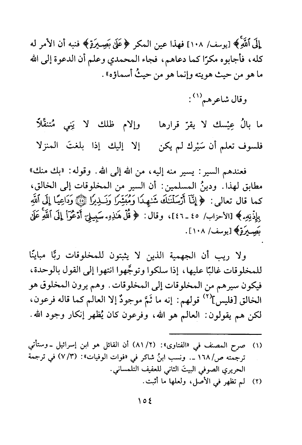 فعندهم السير يسير منه إليه من الله إلى الله وقوله بك منك مطابق لهذا ودينُ المسلمين أن السير من المخلوقات إلى الخالق كما قال تعالى إِنَّا أَرْسَلْنَاكَ شَاهِدًا وَمُبَشِّرًا وَنَذِيرًا (45) وَدَاعِيًا إِلَى اللَّهِ بِإِذْنِهِ [الأحزاب 45-46] وقال قُلْ هَذِهِ سَبِيلِي أَدْعُو إِلَى اللَّهِ عَلَى بَصِيرَةٍ [يوسف 108] .