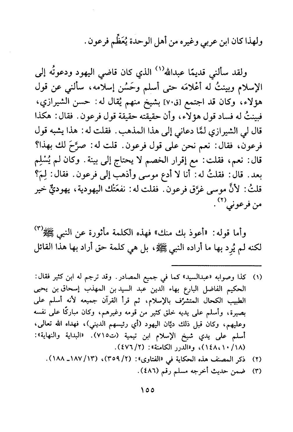 ولقد سألني قديمًا عبد الله* الذي كان قاضي اليهود ودعوتُه إلى الإسلام وبينتُ له أعْلامَه حتى أسلم وحَسُن إسلامه سألني عن قول هؤلاء وكان قد اجتمع بشيخ منهم يُقال له حسن الشيرازي فبينتُ له فساد قول هؤلاء وأن حقيقته حقيقة قول فرعون فقال هكذا قال لي الشيرازي لمَّا دعاني إلى هذا المذهب فقلت له هذا يشبه قول فرعون فقال نعم نحن على قول فرعون قلت له صرَّحَ لك بهذا قال نعم فقلت مع إقرار الخصم لا يحتاج إلى بينة وكان لم يُسْلِم بعد قال فقلتُ له أنا لا أدع موسى وأذهب إلى فرعون فقال لِمَ قلتُ لأنَّ موسى غرَّق فرعون فقلت له نفعَتْك اليهودية يهوديٌّ خير من فرعوني.