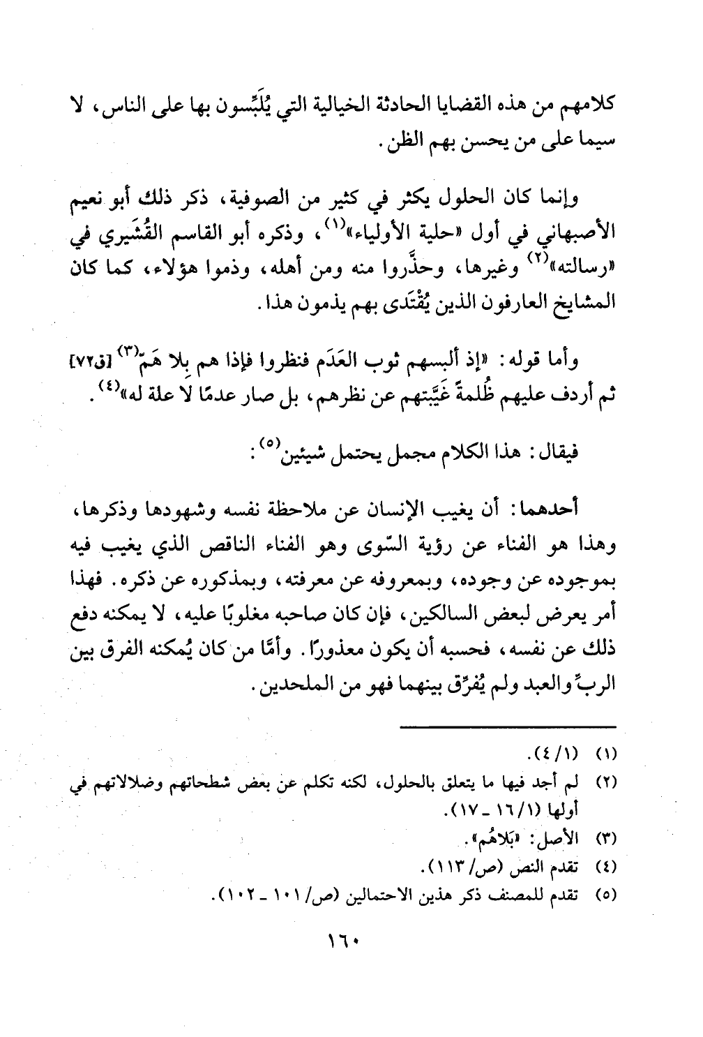 أحدهما أن يغيب الإنسان عن ملاحظة نفسه وشهودها وذكرها وهذا هو الفناء عن رؤية السّوى وهو الفناء الناقص الذي يغيب فيه بموجوده عن وجوده وبمعروفه عن معرفته وبمذكوره عن ذكره فهذا أمر يعرض لبعض السالكين فإن كان صاحبه مغلوبًا عليه لا يمكنه دفع ذلك عن نفسه فحسبه أن يكون معذورًا وأمَّا من كان يُمكنه الفرق بين الربِّ والعبد ولم يُفرِّق بينهما فهو من الملحدين.