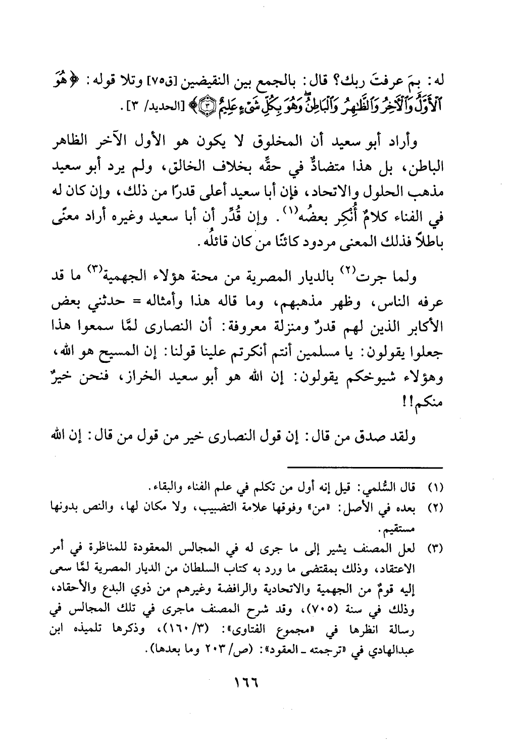 وأراد أبو سعيد أن المخلوق لا يكون هو الأول الآخر الظاهر الباطن بل هذا متضادٌ في حقِّه بخلاف الخالق ولم يرد أبو سعيد مذهب الحلول والاتحاد فإن أبا سعيد أعلى قدرًا من ذلك وإن كان له في الفناء كلامٌ أُنْكِر بعضُه وإن قُدِّر أن أبا سعيد وغيره أراد معنًى باطلاً فذلك المعنى مردود كائنًا من كان قائلُه.
