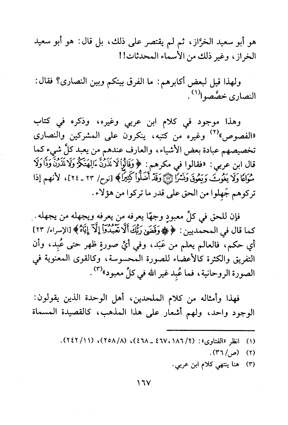 وهذا موجود في كلام ابن عربي وغيره وذكره في كتاب الفصوص وغيره من كتبه ينكرون على المشركين والنصارى تخصيصهم عبادة بعض الأشياء والعارف عندهم من يعبد كلَّ شيء كما قال ابن عربي فقالوا في مكرهم وَقَالُوا لَا تَذَرُنَّ آلِهَتَكُمْ وَلَا تَذَرُنَّ وَدًّا وَلَا سُوَاعًا وَلَا يَغُوثَ وَيَعُوقَ وَنَسْرًا (23) وَقَدْ أَضَلُّوا كَثِيرًا [نوح 23-24] لأنهم إذا تركوهم جَهِلوا من الحق على قدر ما تركوا من هؤلاء.