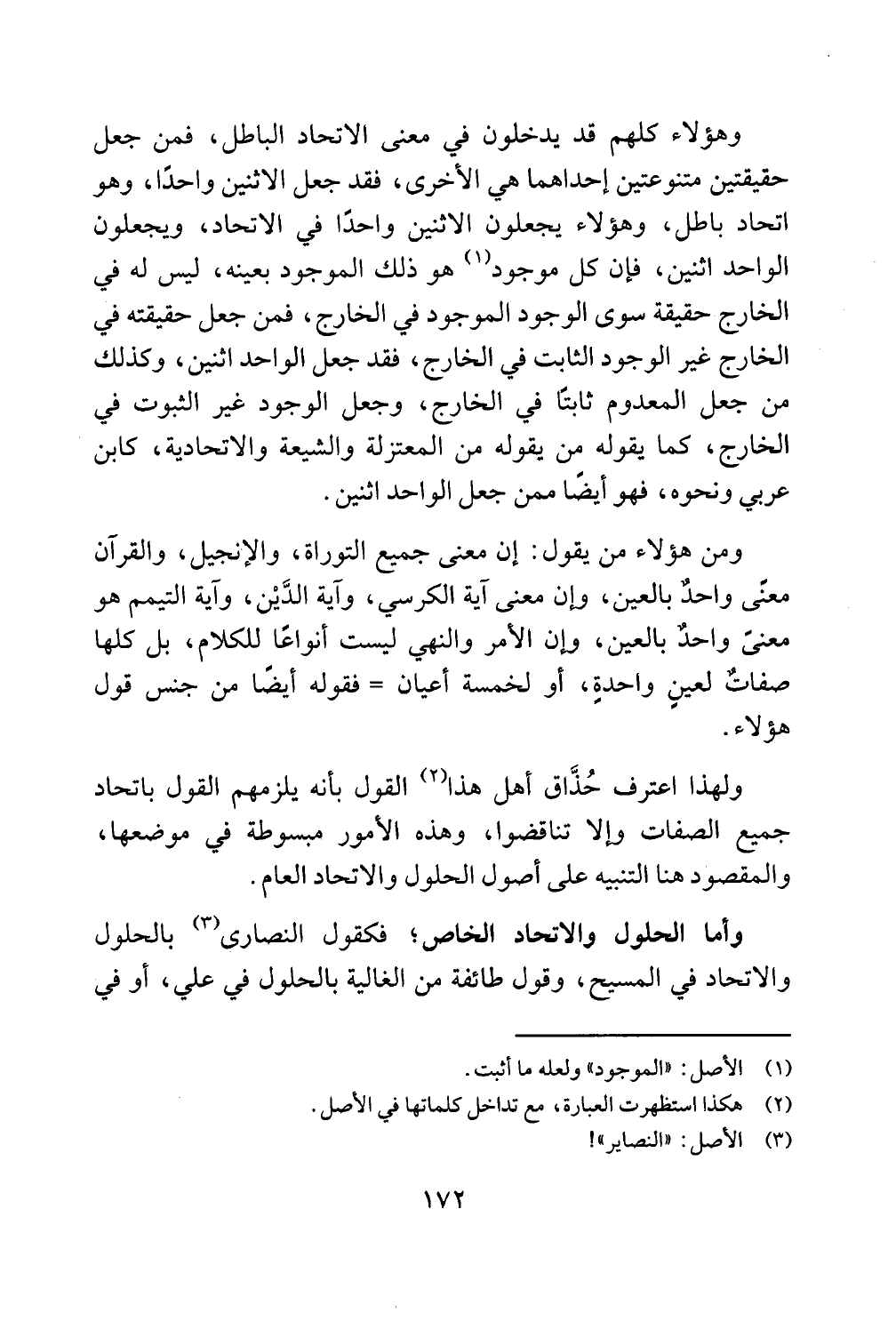 وهؤلاء كلهم قد يدخلون في معنى الاتحاد الباطل فمن جعل حقيقتين متنوعتين إحداهما هي الأخرى فقد جعل الاثنين واحدًا وهو اتحاد باطل وهؤلاء يجعلون الاثنين واحدًا في الاتحاد ويجعلون الواحد اثنين فإن كل موجود هو ذلك الموجود بعينه ليس له في الخارج حقيقة سوى الوجود الموجود في الخارج فمن جعل حقيقته في الخارج غير الوجود الثابت في الخارج فقد جعل الواحد اثنين وكذلك من جعل المعدوم ثابتًا في الخارج وجعل الوجود غير الثبوت في الخارج كما يقوله من يقوله من المعتزلة والشيعة والاتحادية كابن عربي ونحوه فهو أيضًا ممن جعل الواحد اثنين.