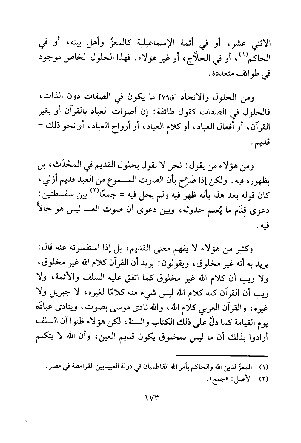 الاثني عشر أو في أئمة الإسماعيلية كالمعزِّ وأهل بيته أو في الحاكم أو في الحلاَّج أو غير هؤلاء فهذا الحلول الخاص موجود في طوائف متعددة.