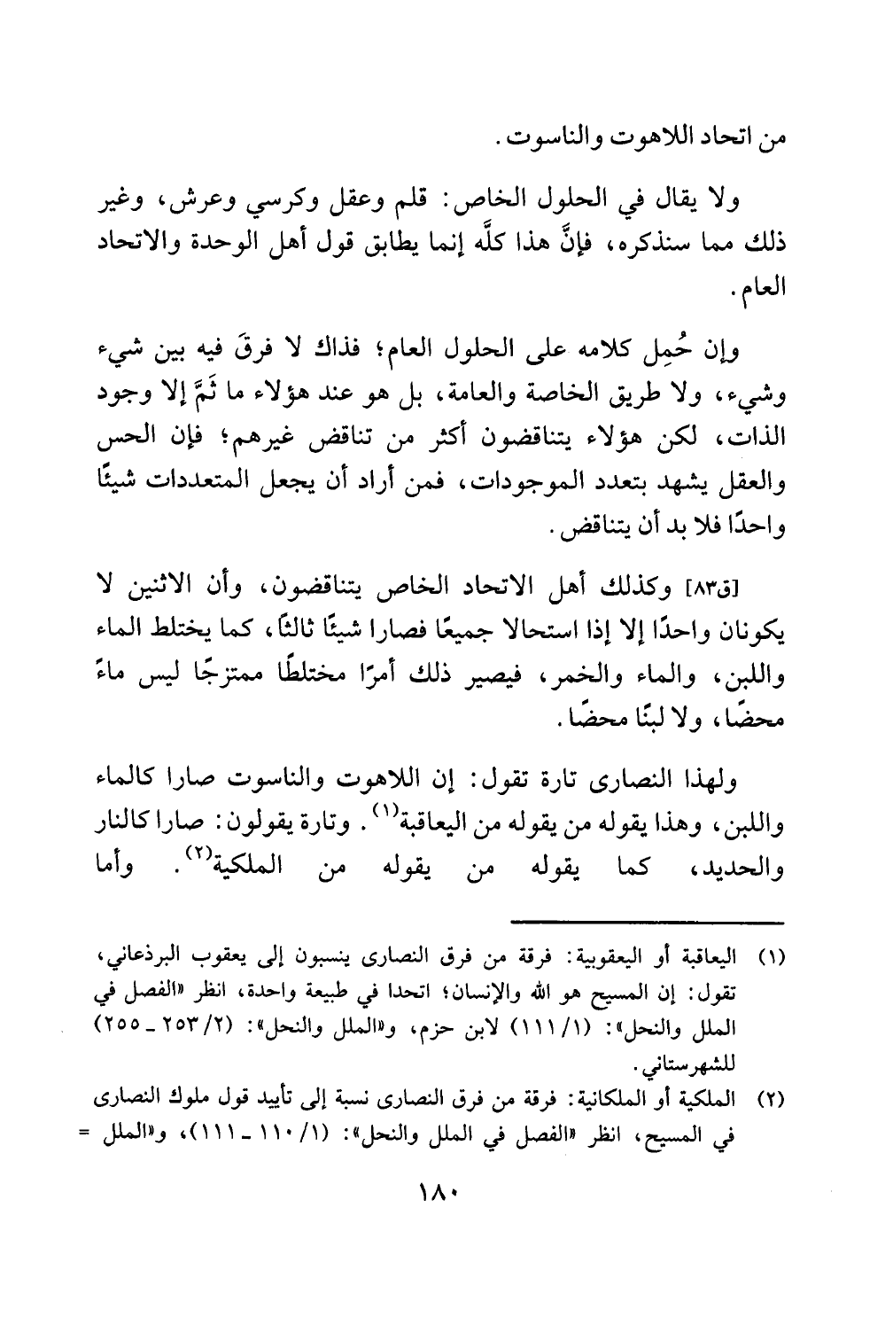 ولهذا النصارى تارة تقول إن اللاهوت والناسوت صارا كالماء واللبن وهذا يقوله من يقوله من اليعاقبة وتارة يقولون صارا كالنار والحديد كما يقوله من يقوله من الملكية وأما