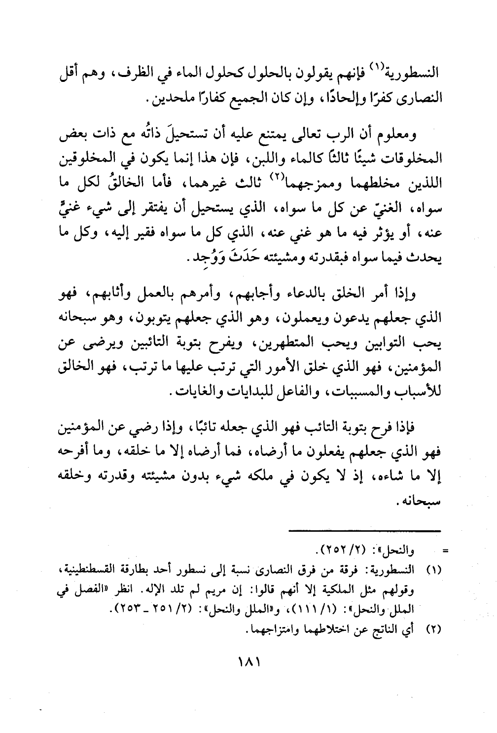 ومعلوم أن الرب تعالى يمتنع عليه أن تستحيلَ ذاتُه مع ذات بعض المخلوقات شيئًا ثالثًا كالماء واللبن فإن هذا إنما يكون في المخلوقين اللذين مخلطهما وممزجهما ثالث غيرهما فأما الخالقُ لكل ما سواه الغنيّ عن كل ما سواه الذي يستحيل أن يفتقر إلى شيء غنيٍّ عنه أو يؤثر فيه ما هو غني عنه الذي كل ما سواه فقير إليه وكل ما يحدث فيما سواه فبقدرته ومشيئته حَدَثَ وَوُجِد.