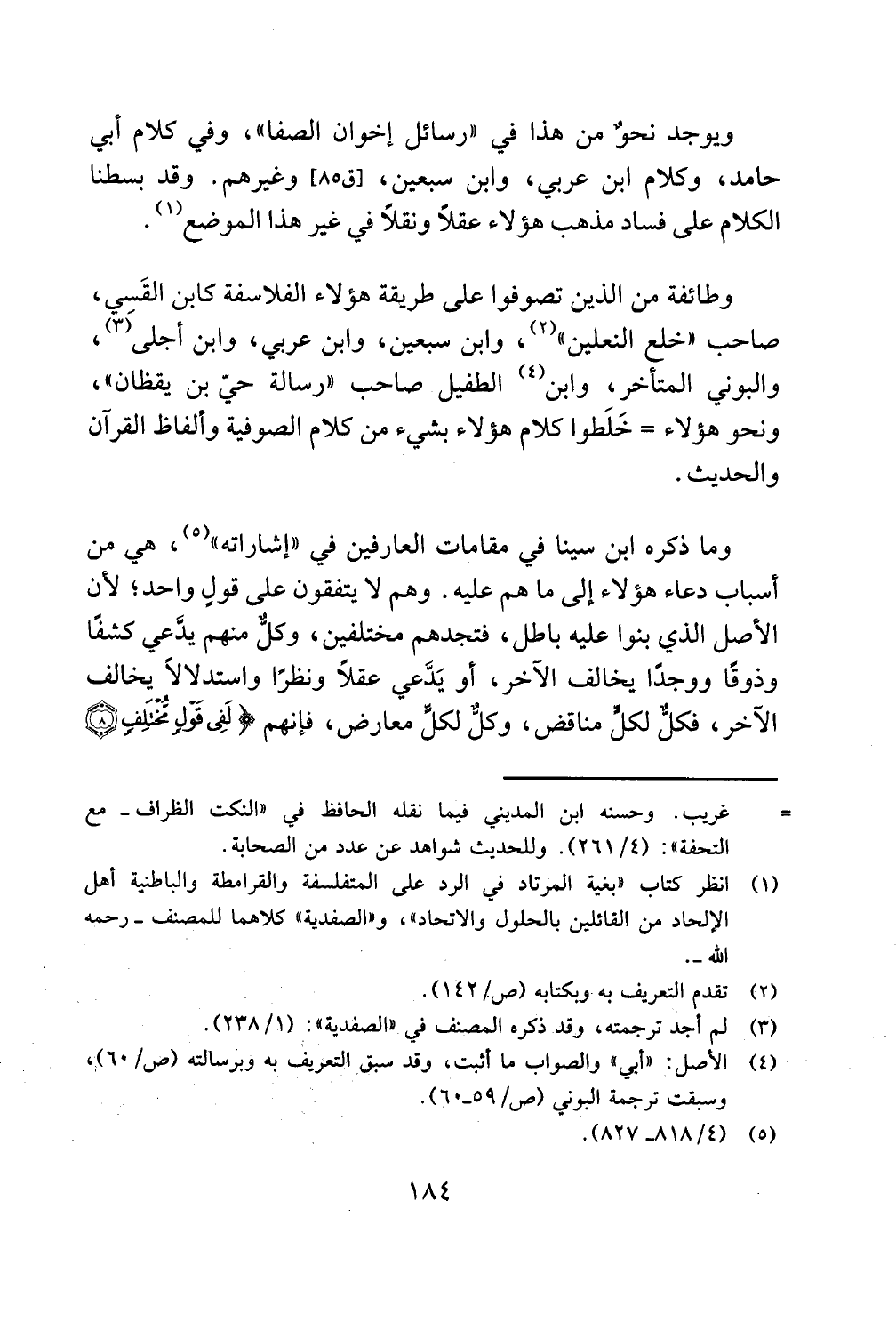 ويوجد نحوٌ من هذا في رسائل إخوان الصفا وفي كلام أبي حامد وكلام ابن عربي وابن سبعين وغيرهم وقد بسطنا الكلام على فساد مذهب هؤلاء عقلاً ونقلاً في غير هذا الموضع.