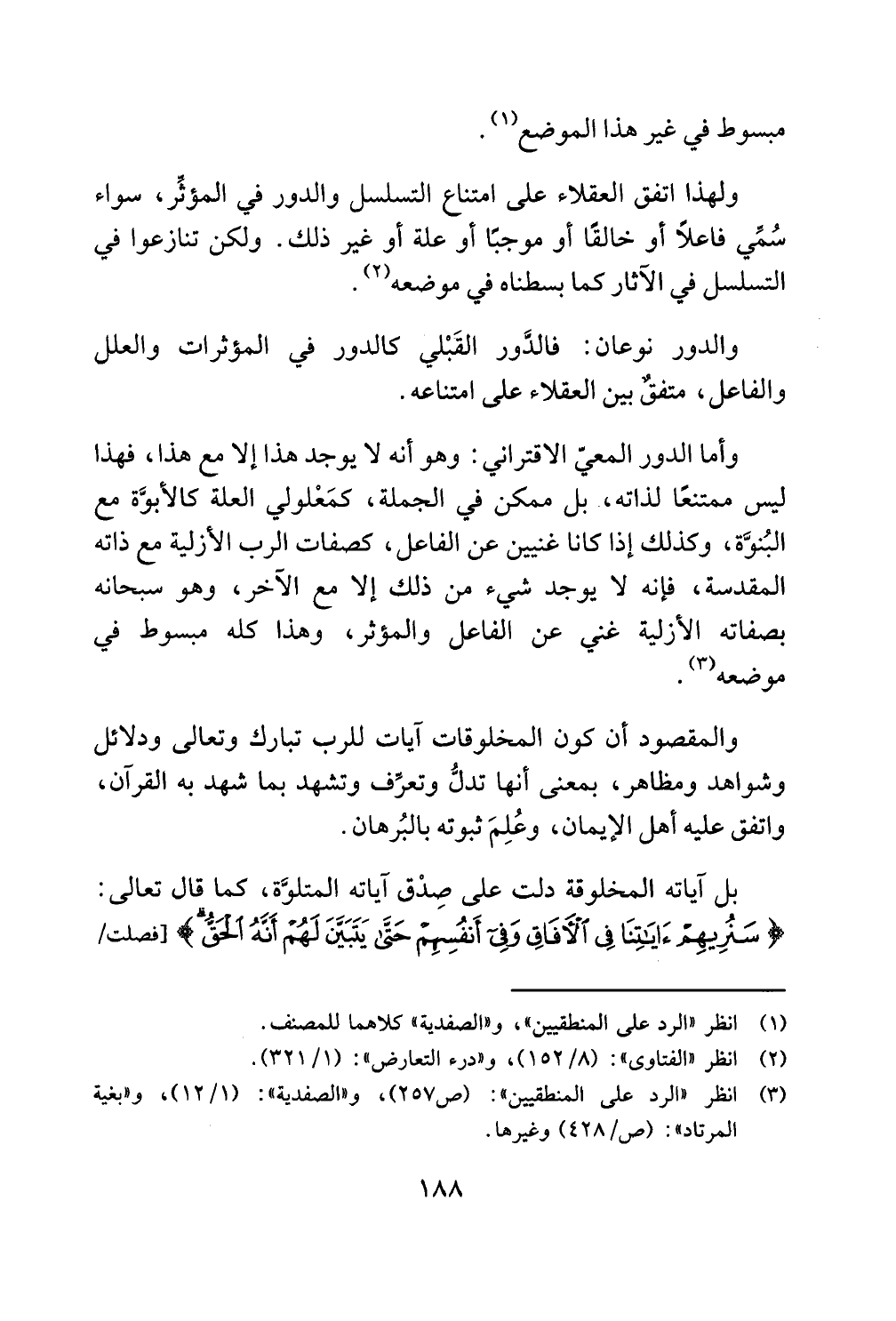 ولهذا اتفق العقلاء على امتناع التسلسل والدور في المؤثِّر سواء سُمِّي فاعلاً أو خالقًا أو موجبًا أو علة أو غير ذلك ولكن تنازعوا في التسلسل في الآثار كما بسطناه في موضعه.