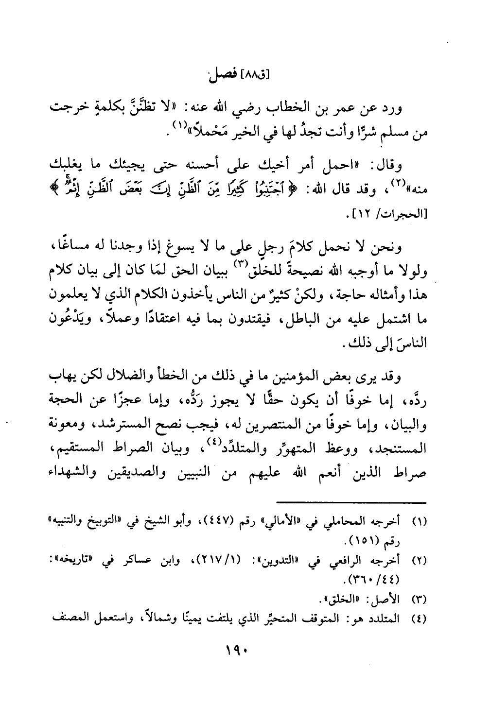 ورد عن عمر بن الخطاب رضي الله عنه لا تظنَّنَّ بكلمةٍ خرجت من مسلم شرًّا وأنت تجدُ لها في الخير مَحْملاً.