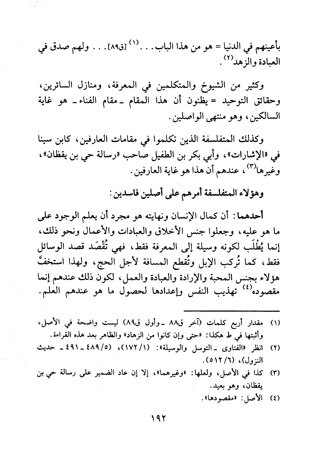 أحدهما أن كمال الإنسان ونهايته هو مجرد أن يعلم الوجود على ما هو عليه وجعلوا جنس الأخلاق والعبادات والأعمال ونحو ذلك إنما يُطْلَب لكونه وسيلة إلى المعرفة فقط فهي تُقْصَد قصد الوسائل فقط كما تُركب الإبل وتُقطع المسافة لأجل الحج ولهذا استخفَّ هؤلاء بجنس المحبة والإرادة والعبادة والعمل لكون ذلك عندهم إنما مقصوده تهذيب النفس وإعدادها لحصول ما هو عندهم العلم.
