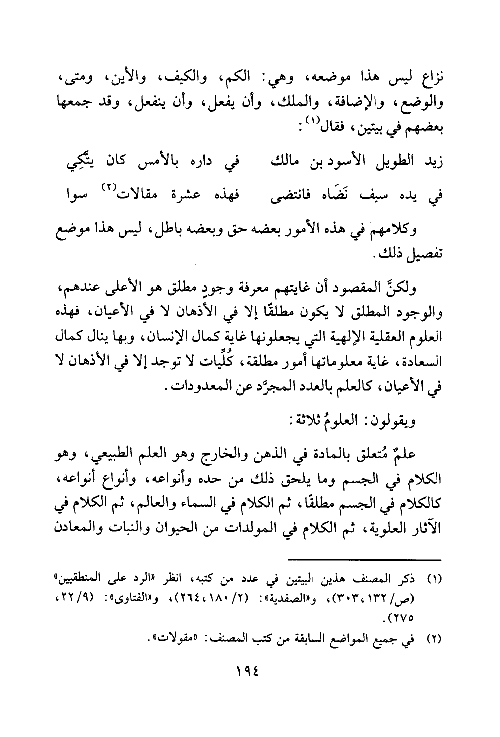 ولكنَّ المقصود أن غايتهم معرفة وجودٍ مطلق هو الأعلى عندهم والوجود المطلق لا يكون مطلقًا إلا في الأذهان لا في الأعيان فهذه العلوم العقلية الإلهية التي يجعلونها غاية كمال الإنسان وبها ينال كمال السعادة غاية معلوماتها أمور مطلقة كُلِّيات لا توجد إلا في الأذهان لا في الأعيان كالعلم بالعدد المجرَّد عن المعدودات.