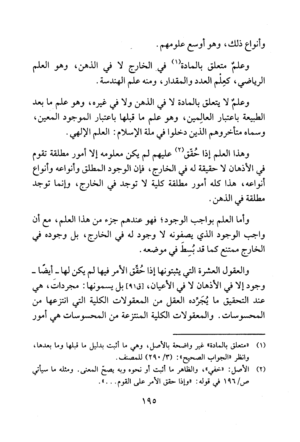 وعلمٌ لا يتعلق بالمادة لا في الذهن ولا في غيره وهو علم ما بعد الطبيعة باعتبار العالِمين وهو علم ما قبلها باعتبار الموجود المعين وسماه متأخروهم الذين دخلوا في ملة الإسلام العلم الإلهي.