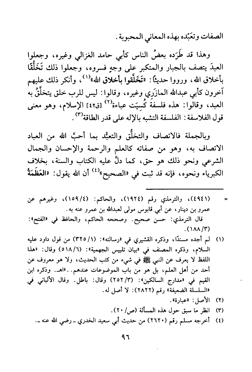 وهذا قد طَرَده بعضُ الناس كأبي حامد الغزالي وغيره وجعلوا العبدَ يتصف بالجبار والمتكبر على وجهٍ فسروه وجعلوا ذلك تَخَلُّقًا بأخلاق الله ورووا حديثًا تَخَلَّقوا بأخلاق الله وأنكر ذلك عليهم آخرون كأبي عبد الله المازَرِي وغيره وقالوا ليس للرب خلق يتخلَّقُ به العبد وقالوا هذه فلسفة كُسِيَت عباءة الإسلام وهو معنى قول الفلاسفة الفلسفة التشبه بالإله على قدر الطاقة.
