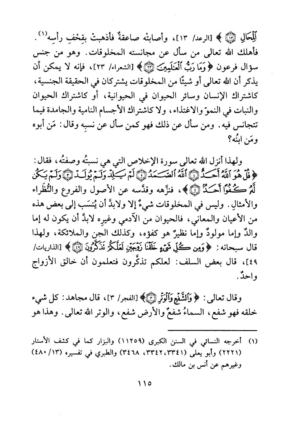 ولهذا أنزل الله تعالى سورة الاخلاص التي هي نسبته وصفته، فقال: