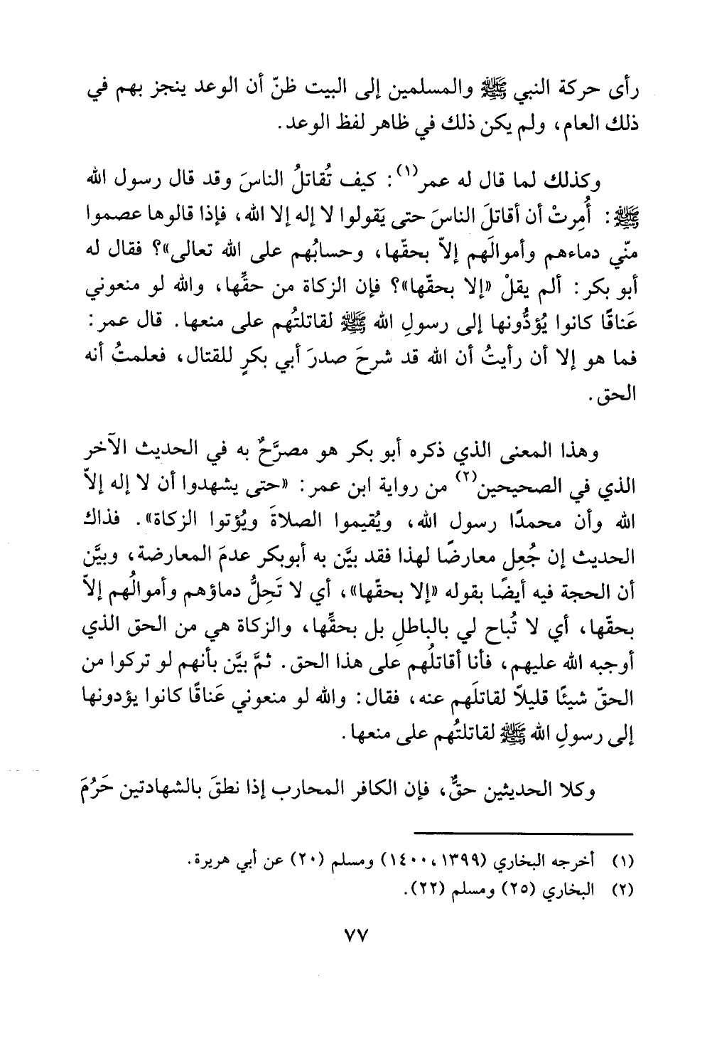 وكذلك لما قال له عمر (1): كيف تقاتل الناس وقد قال رسول الله