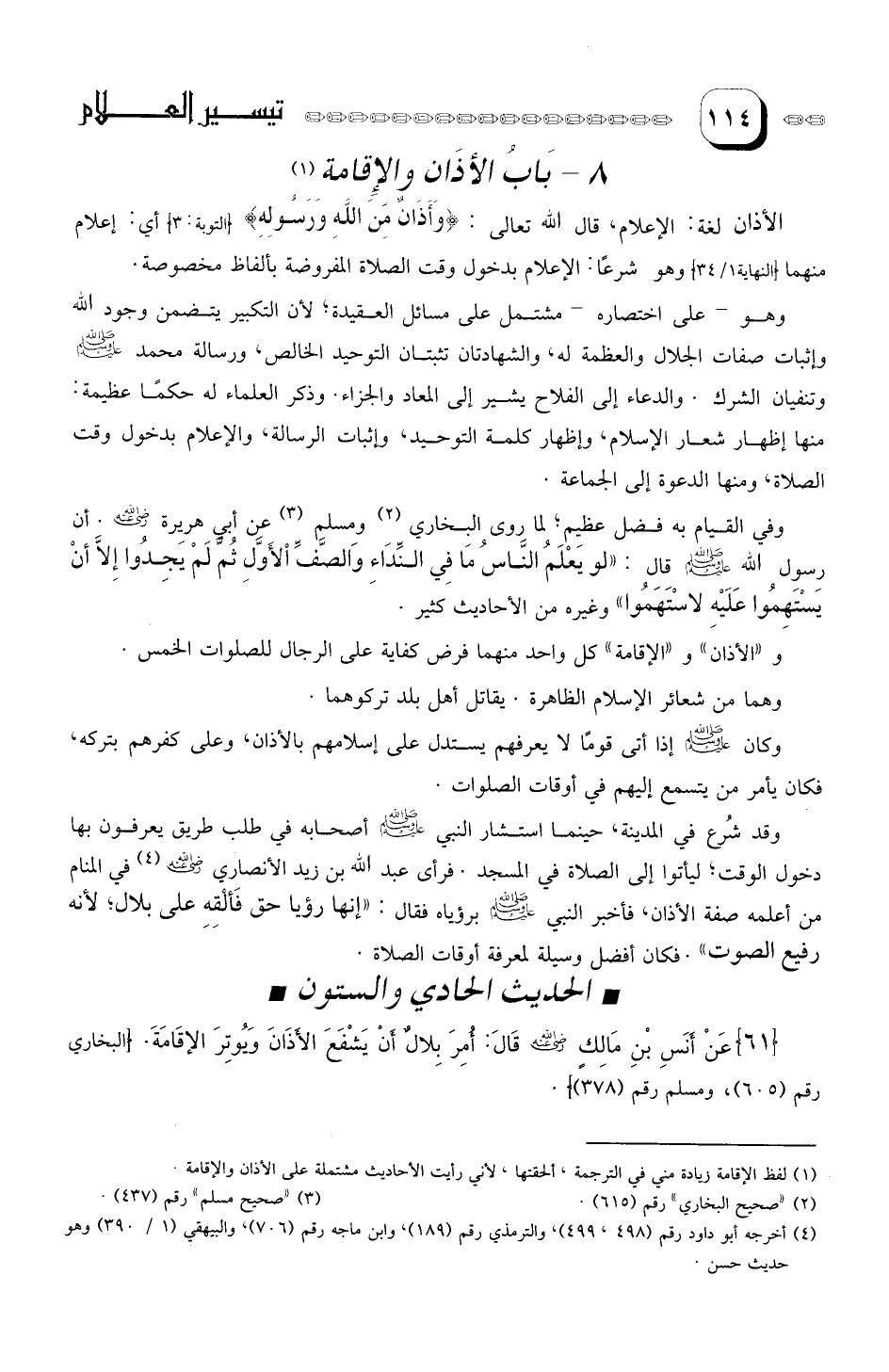 (¬1) لفظ الإقامة زيادة مني في الترجمة، ألحقتها، لأني رأيت الأحاديث محتملة على الأذان والإقامة.