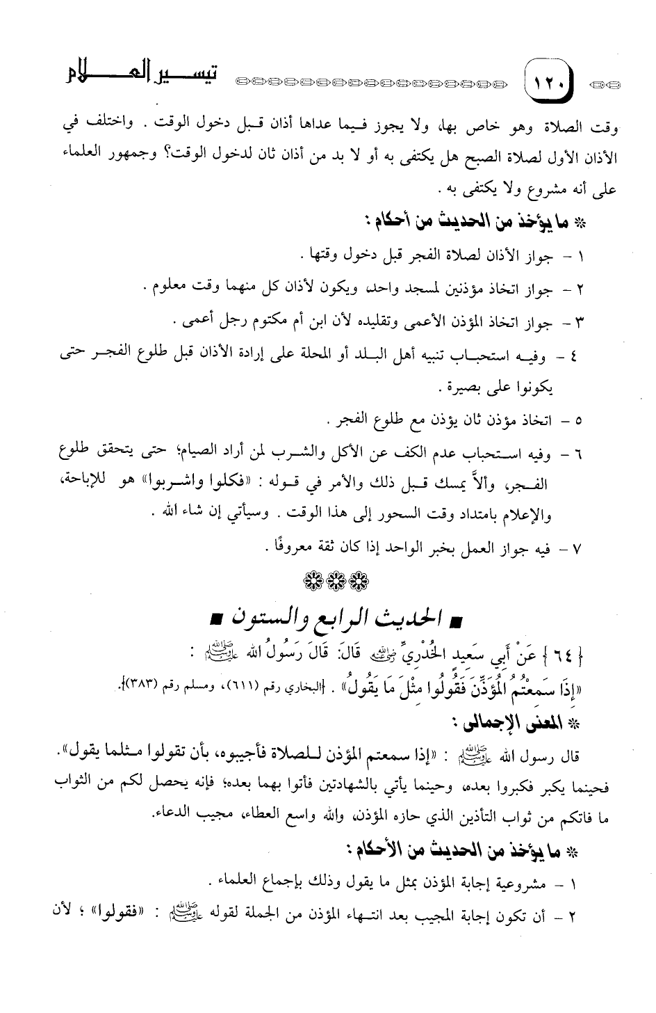 6- وفيه استحباب عدم الكَف عن الأكل والشرب لمن أراد الصيام حتى يتحقق طلوع الفجر، وأن لا يمسك قبل ذلك والأمر في قوله: " فكلوا واشربوا " هو للإباحة، والإعلام بامتداد وقت السحور إلى هذا الوقت. وسيأتي إن شاء الله.