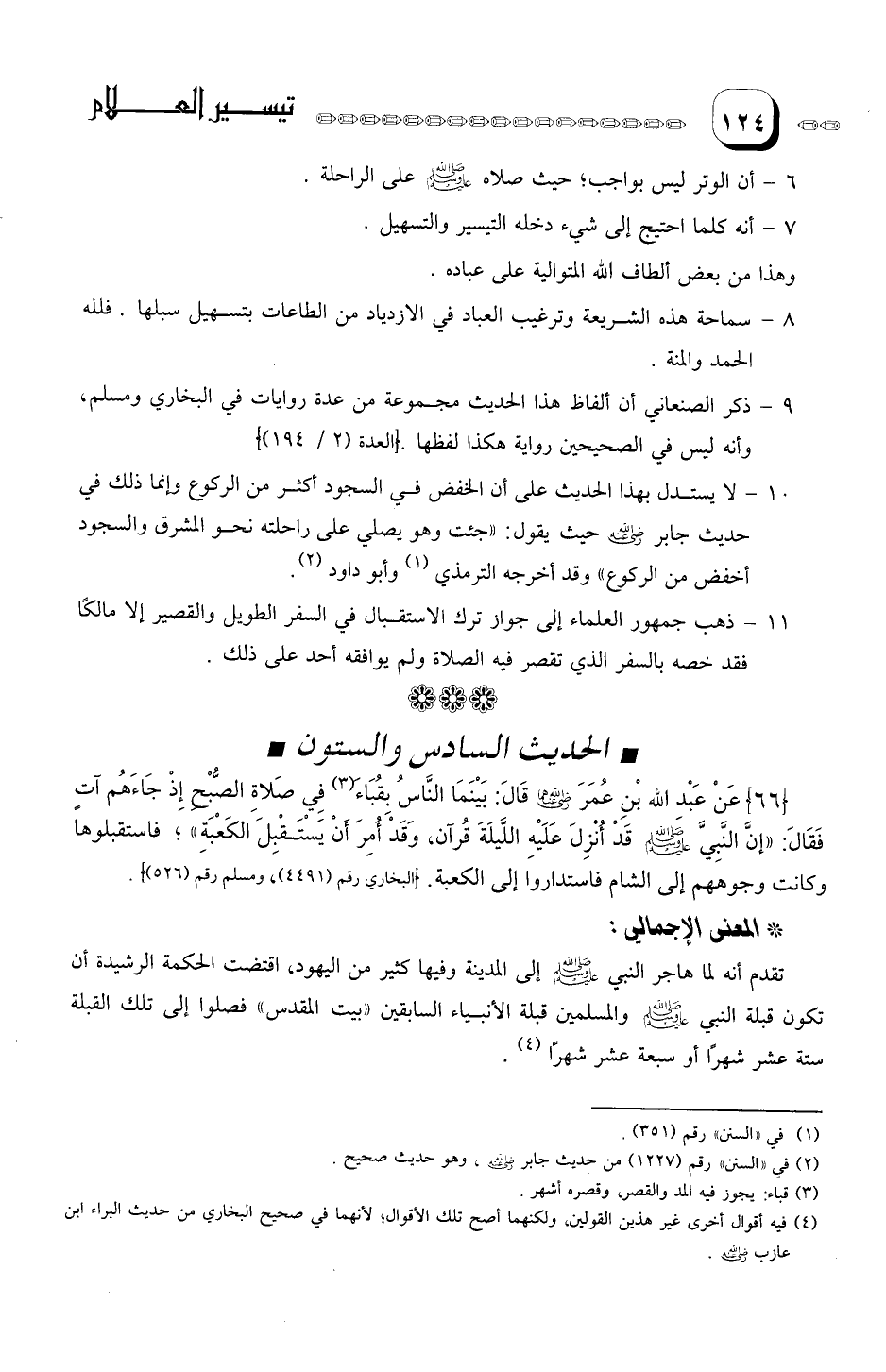 عَبْد الله بْنِ عُمَرَ رضي الله عَنْهُمَا قالَ: بَيْنَمَا النَّاسُ بقُبَاءَ (¬1) في صَلاَةِ الصُّبْحِ إِذْ جَاءَهُم آتٍ فقَالَ: إنَّ النّبِيّ صلى الله عليه وسلم قدْ أنْزلَ عَلَيْهِ اللَّيلَة قُرْآنٌ، وقدْ أمر أنْ يَسْتَقْبِلَ الْكَعْبةِ" فاستقبلوها وكانت وجوههم إلى الشام فاستداروا إلى الكعبة.