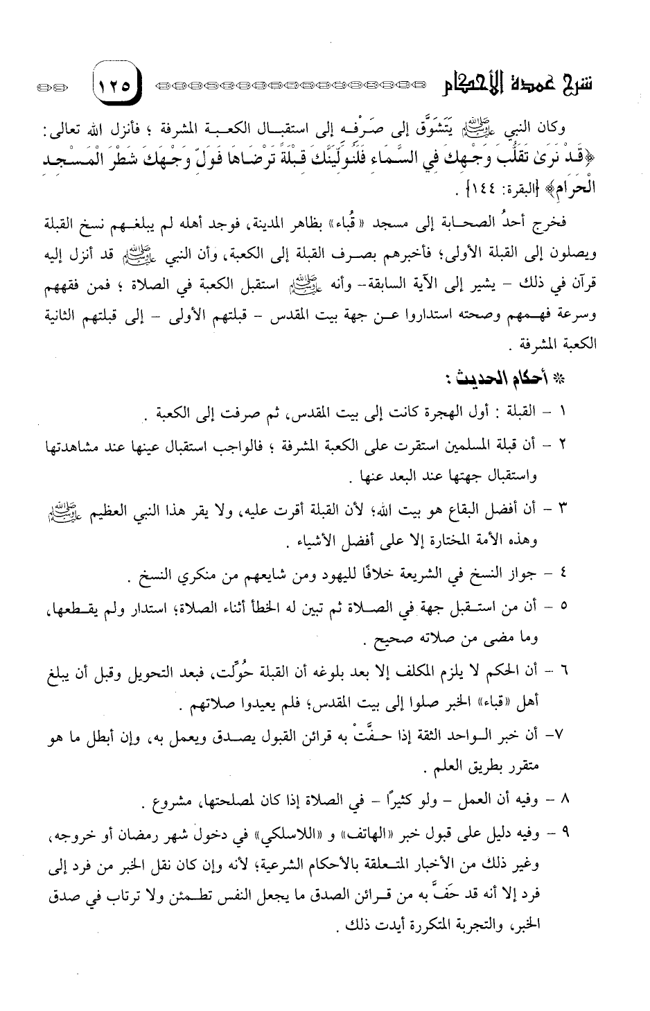 6- أن الحكم لا يلزم المكلف إلا بعد بلوغه، فإن القبلة حُولت، فبعد التحويل وقبل أن يبلغ أهل " قباء " الخبر، صلوا إلى بيت المقدس، فلم يعيدوا صلاتهم.