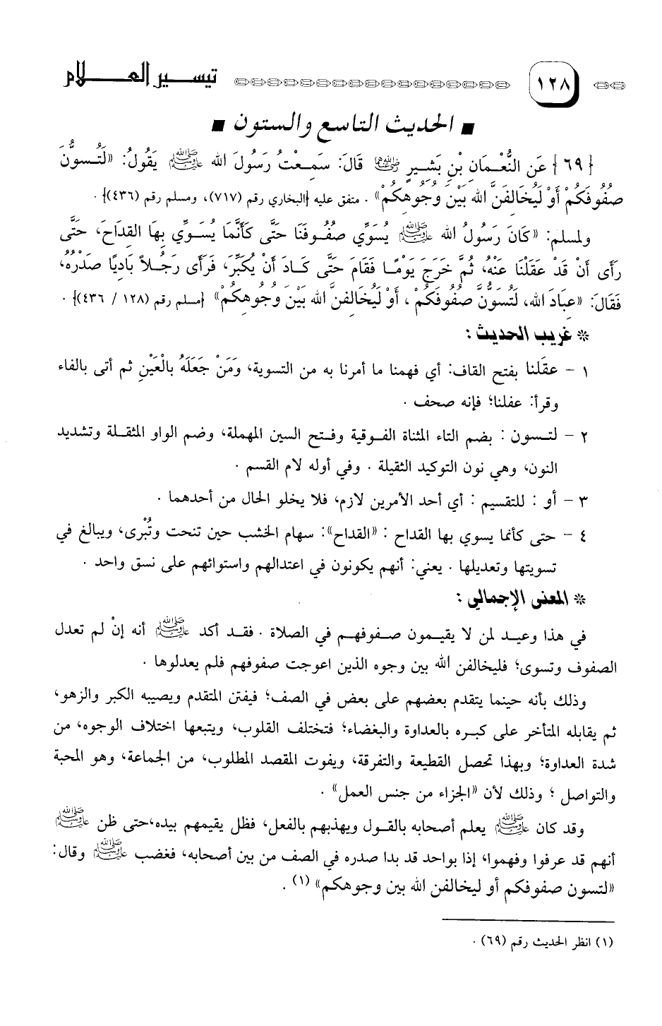 عَنِ النُعْمَانِ بْنِ بَشِيرٍ رَضيَ الله عَنْهُ، قَالَ: سَمِعْتُ رَسُولَ الله صلى الله عليه وسلم يَقُول: " لتسونَّ صُفُوفَكُم أوْ ليخَالِفَنَّ الله بَيْنَ وُجُوهِكُم ". متفق عليه