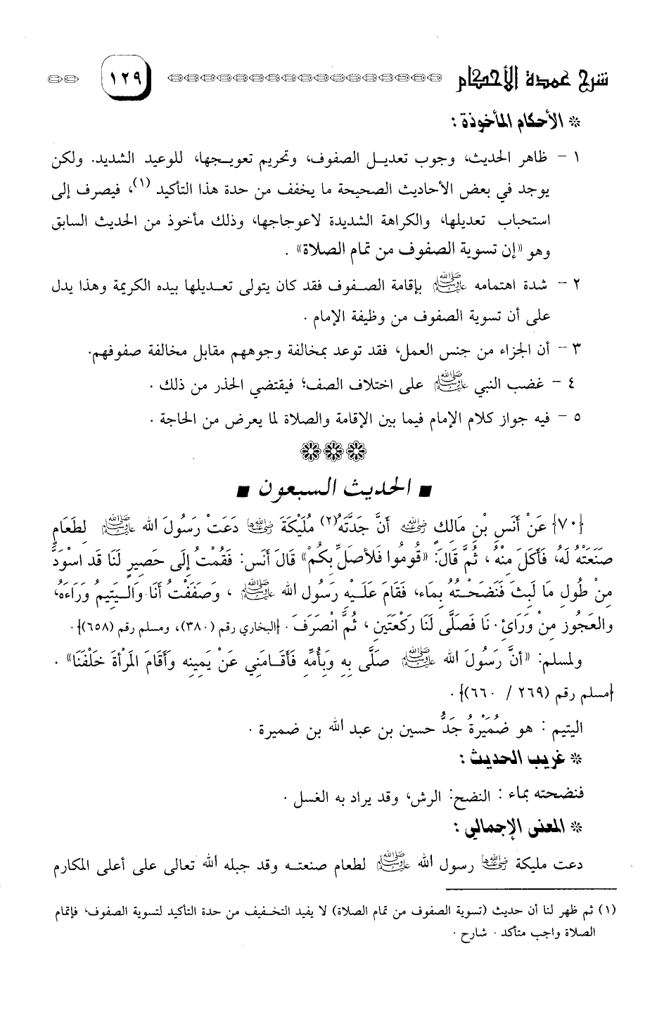 2- شدة اهتمامه صلى الله عليه وسلم بإقامة الصفوف، فقد كان يتولى تعديلها بيده الكريمة وهذا يدل على أن تسوية الصفوف من وظيفة الإمام.