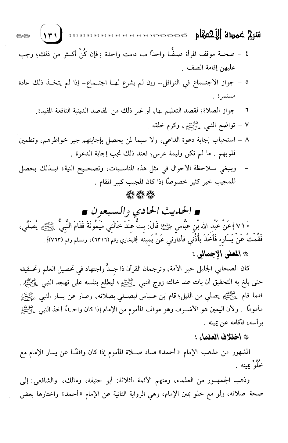 عَنْ عَبْدِ الله بْنِ عبَّاس رضيَ الله عَنْهُمَا قال: بِتُّ عِنْدَ خَالَتِي مَيْمُونَةَ فَقَامَ النَبيُّ صلى الله عليه وسلم يُصَلى مِنَ الليْل، فَقُمْتُ عن يَسَارهِ فَأخَذ برأسي فأقامني عَنْ يَمِينه.