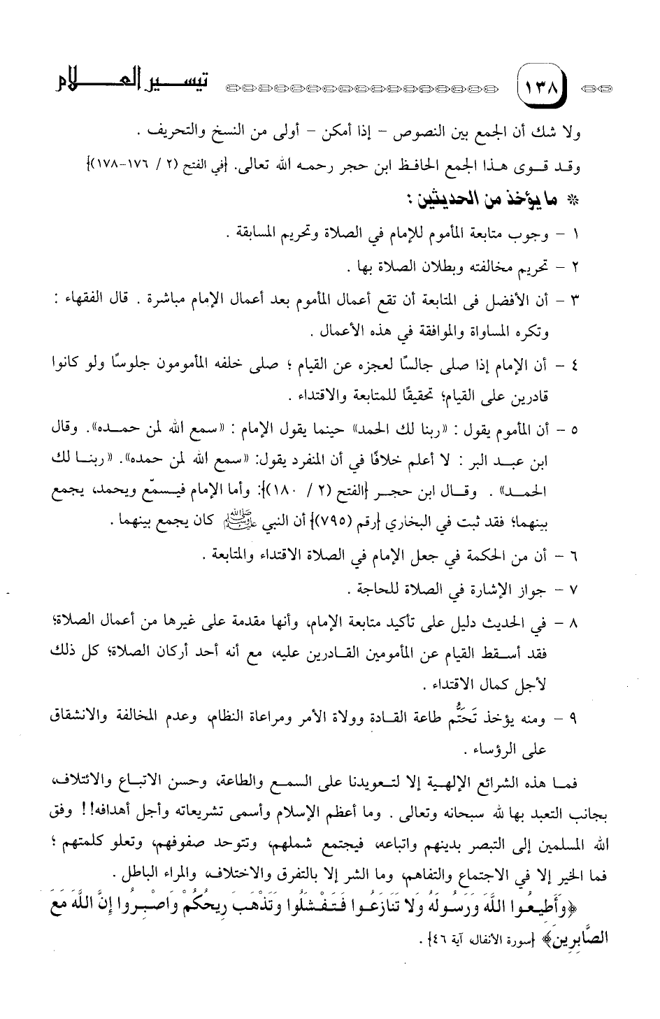 8- في الحديث دليل على تأكيد متابعة الإمام، وأنها مقدمة على غيرها من أعمال الصلاة، فقد أسقط القيام عن المأمومين القادرين عليه، مع أنه أحد أركان الصلاة، كل ذلك لأجل كمال الاقتداء.
