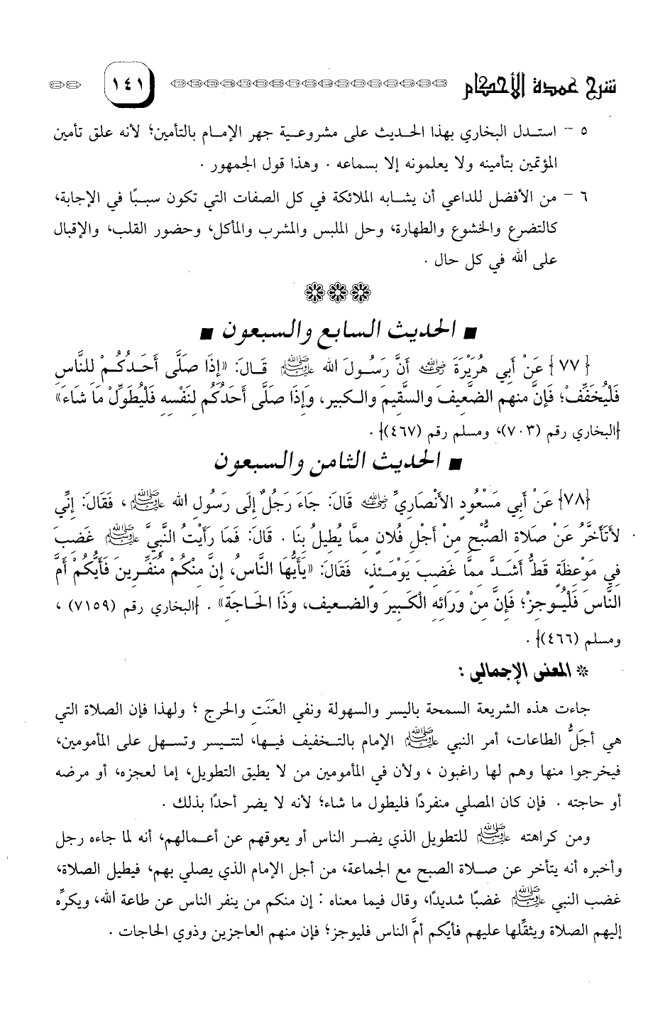 ولهذا " فإن الصلاة التي هي أجل الطاعات " أمر النبي صلى الله عليه وسلم الإمام التخفيف فيها، لتتيسر وتسهل على المأمومين، فيخرجوا منها وهم لها راغبون. ولأن في المأمومين من لا يطيق التطويل، إما لعجزه. أو مرضه أو حاجته.