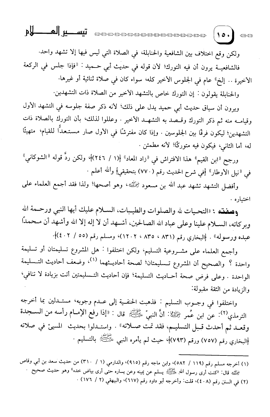ويرون أن سياق حديث أبي حميد يدل على ذلك، لأنه ذكر صفة جلوسه في التشهد الأول وقيامه منه، ثم ذكر التورك، وقصد به التشهد الأخير.